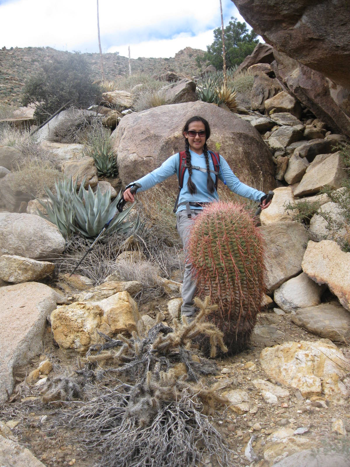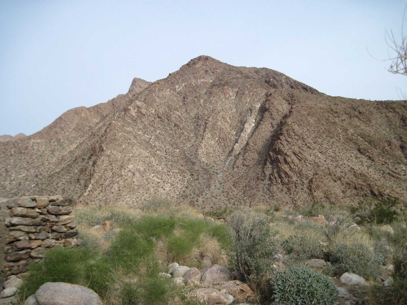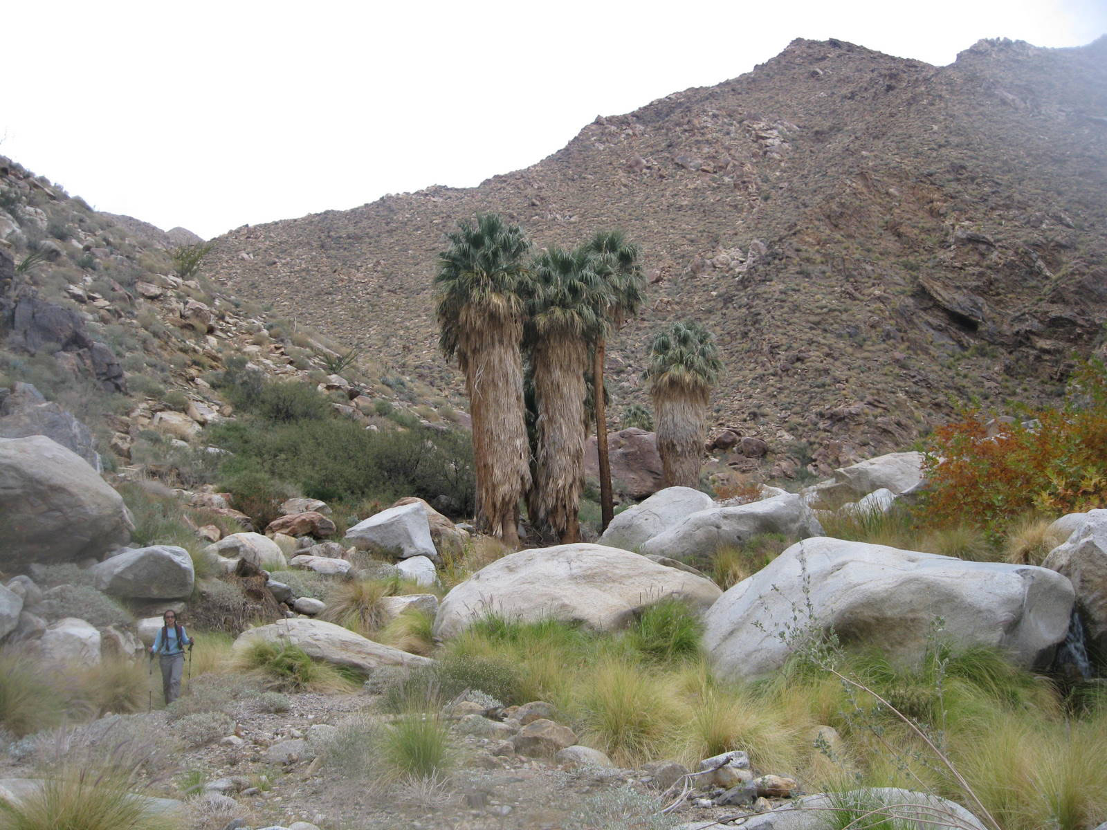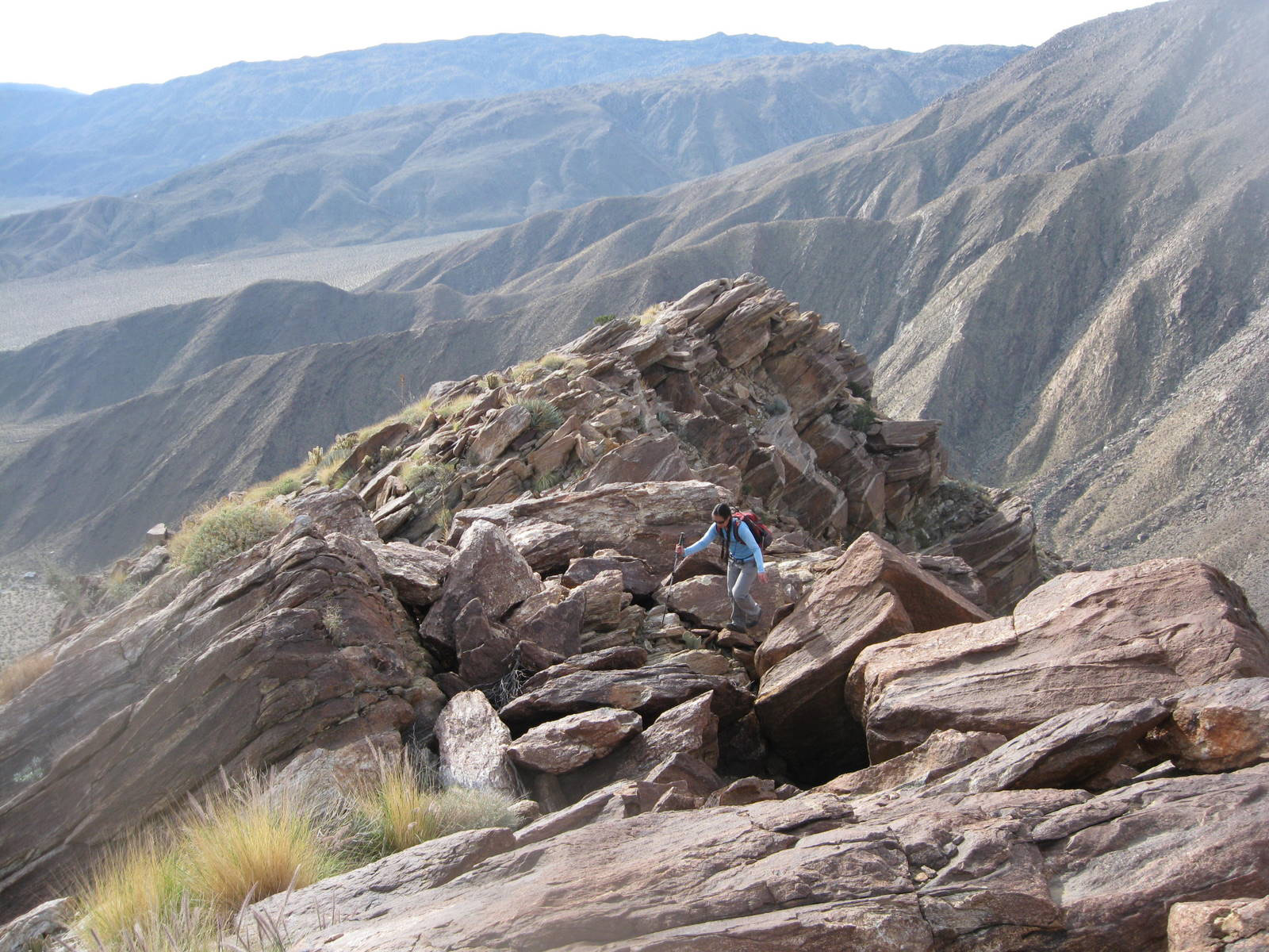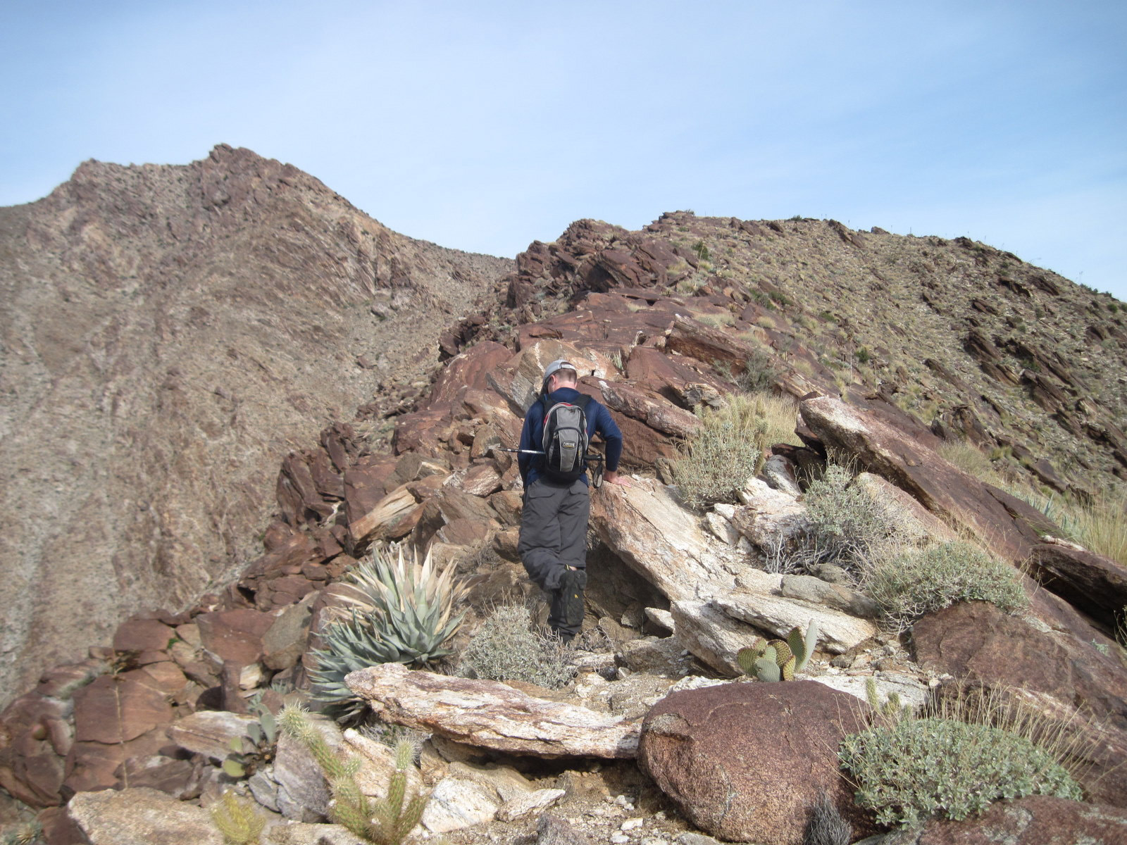 One of the tougher single peak outings in San Diego County, this was my 2nd time up Indianhead Peak this year, and this trip marked Anna’s 50th San Diego County peak. We enjoyed the steep climbing, reddish rock, and excellent views. We ascended the SE ridge and came down the SW slopes, descending through beautiful Borrego Palm Canyon, seeing bats, frogs, and huge palm trees along the way.