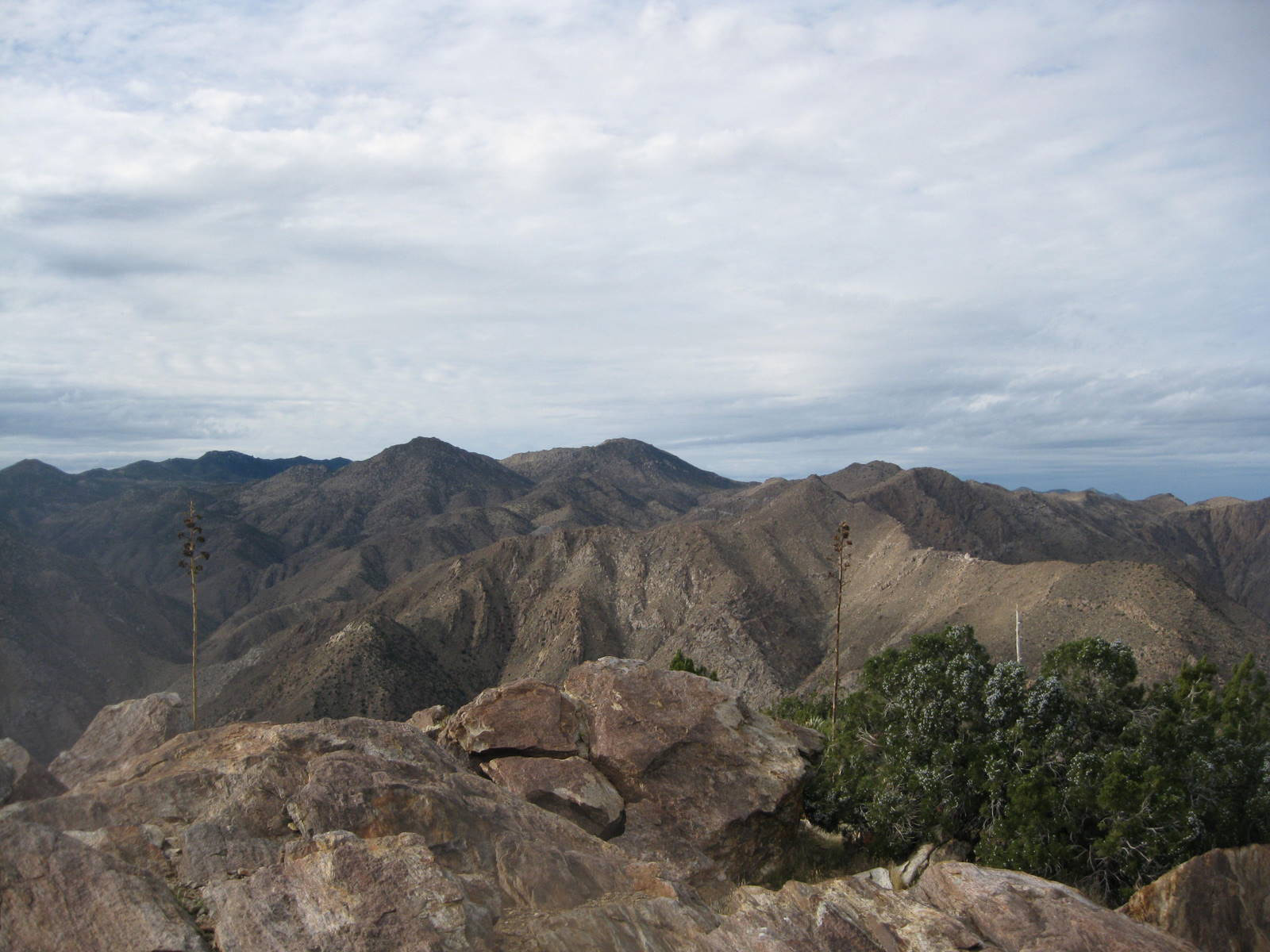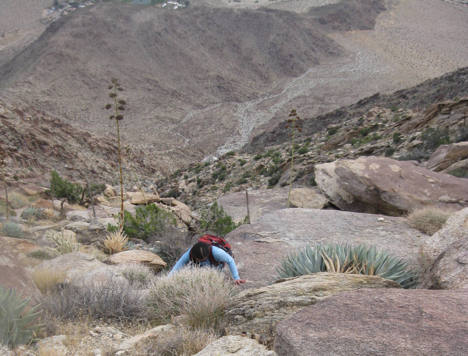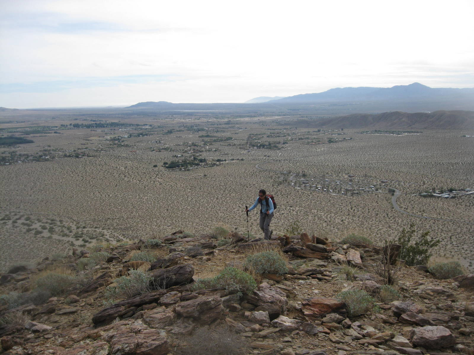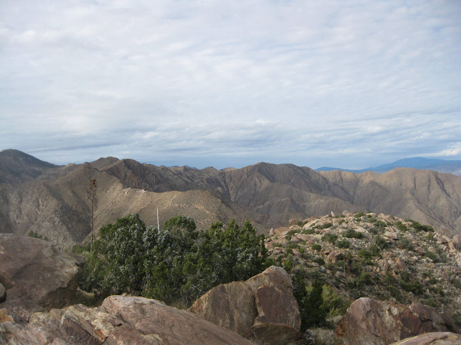 One of the tougher single peak outings in San Diego County, this was my 2nd time up Indianhead Peak this year, and this trip marked Anna’s 50th San Diego County peak. We enjoyed the steep climbing, reddish rock, and excellent views. We ascended the SE ridge and came down the SW slopes, descending through beautiful Borrego Palm Canyon, seeing bats, frogs, and huge palm trees along the way.