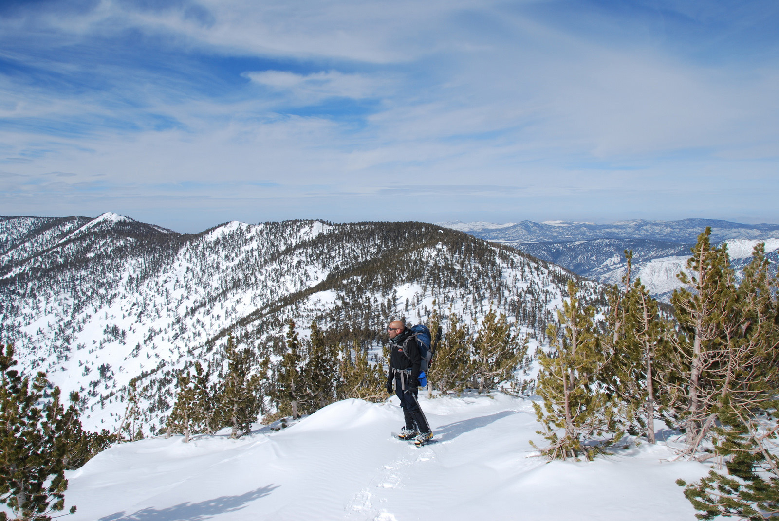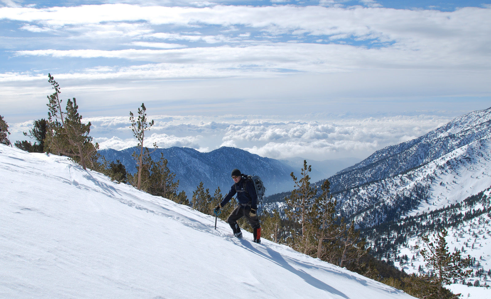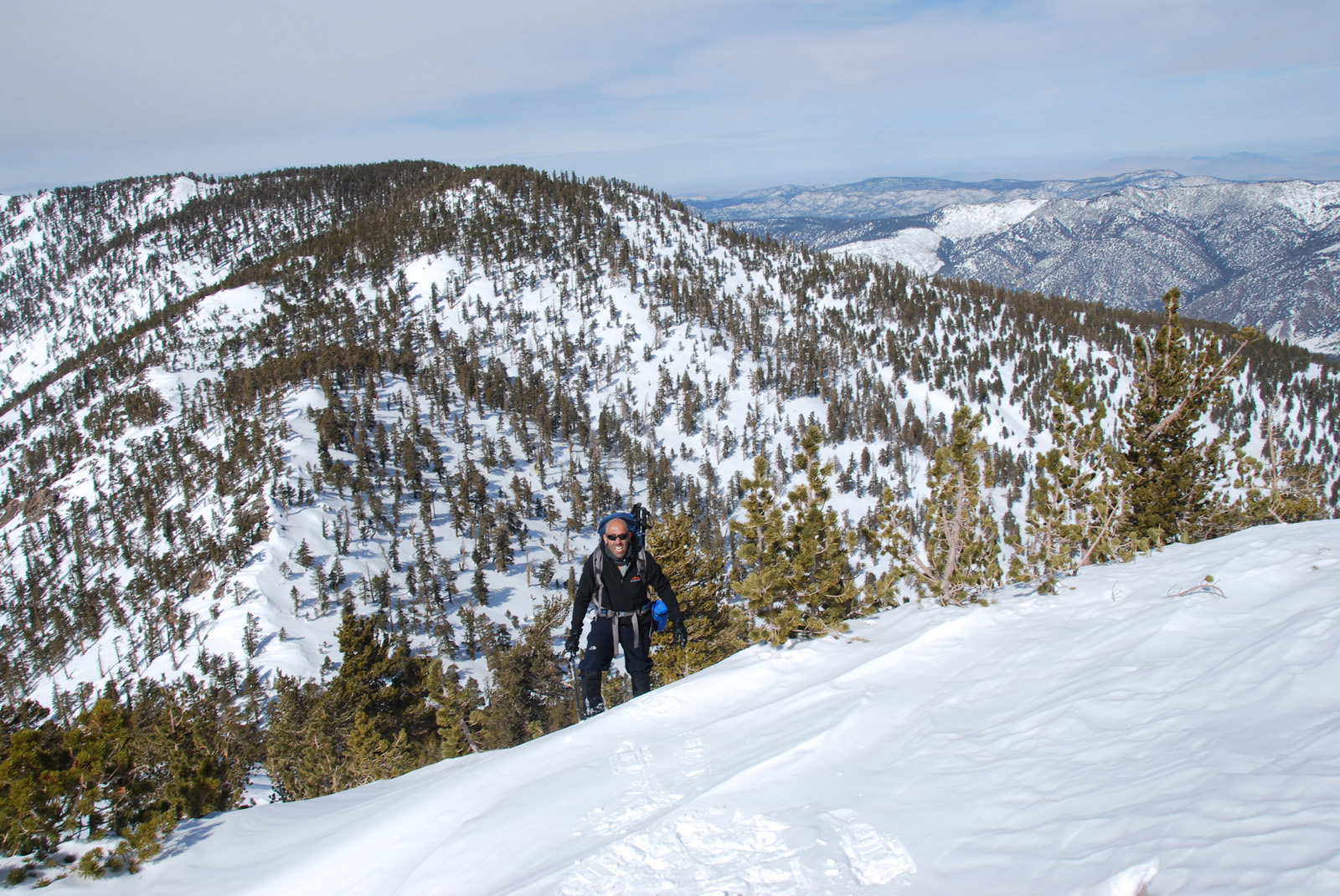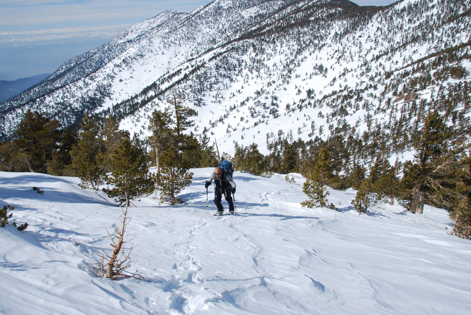 Mt. Charlton is a 10800 ft peak in the San Gorgonio wildeness is San Bernadino County. We intended to climb a steep couloir on the north side of the mountain, but with the recent snowfall and cold temperatures, the snow was unconsolidated and we bailed on our intended route. We measured temperatures to be 10 degrees F at 8am and broke trail on snowshoes from our 8000 foot camp all the way to the summit.