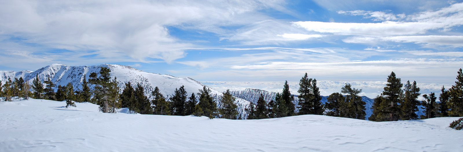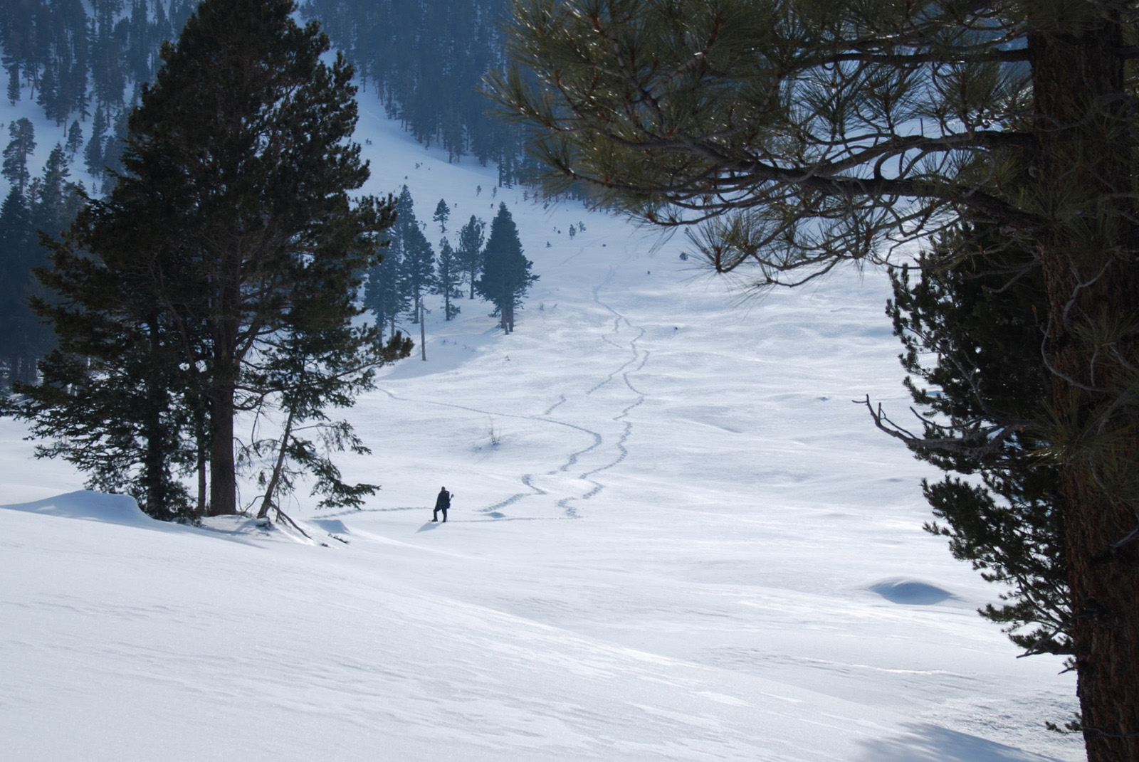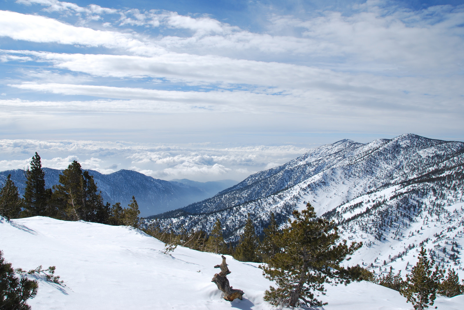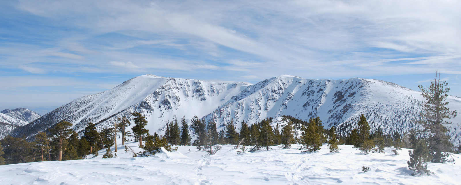 Mt. Charlton is a 10800 ft peak in the San Gorgonio wildeness is San Bernadino County. We intended to climb a steep couloir on the north side of the mountain, but with the recent snowfall and cold temperatures, the snow was unconsolidated and we bailed on our intended route. We measured temperatures to be 10 degrees F at 8am and broke trail on snowshoes from our 8000 foot camp all the way to the summit.