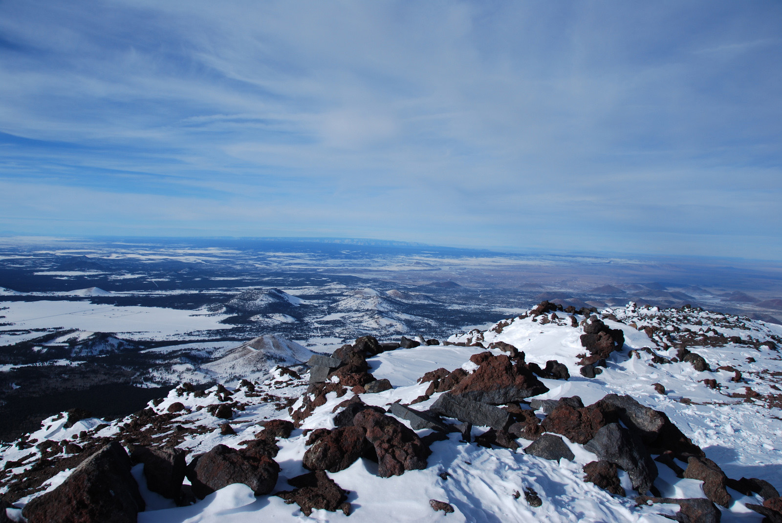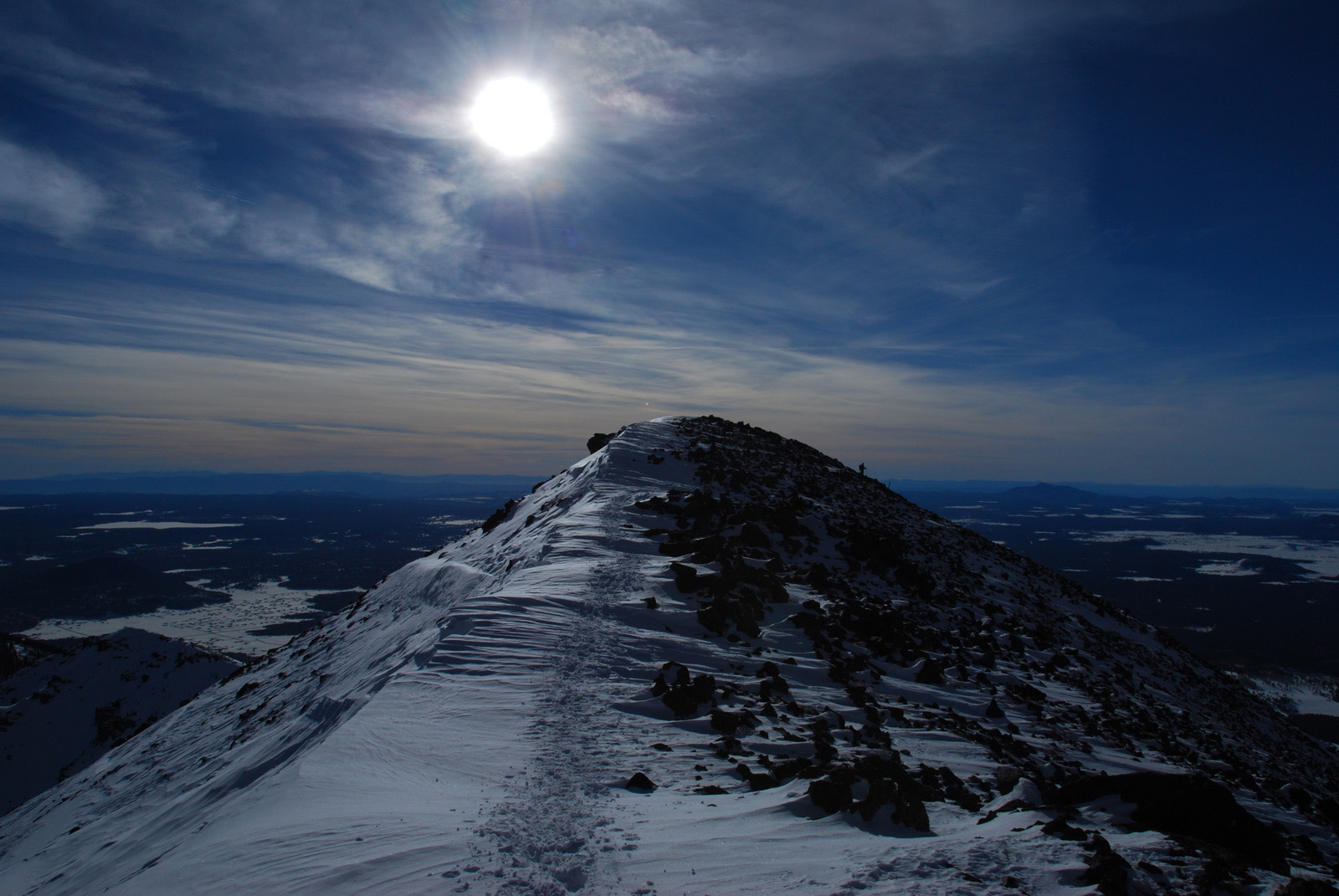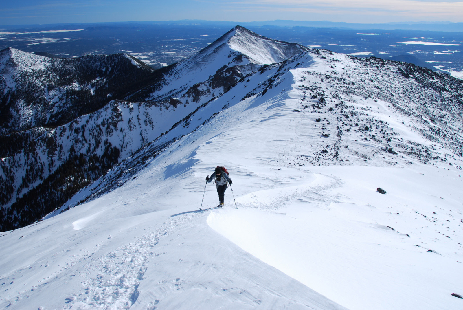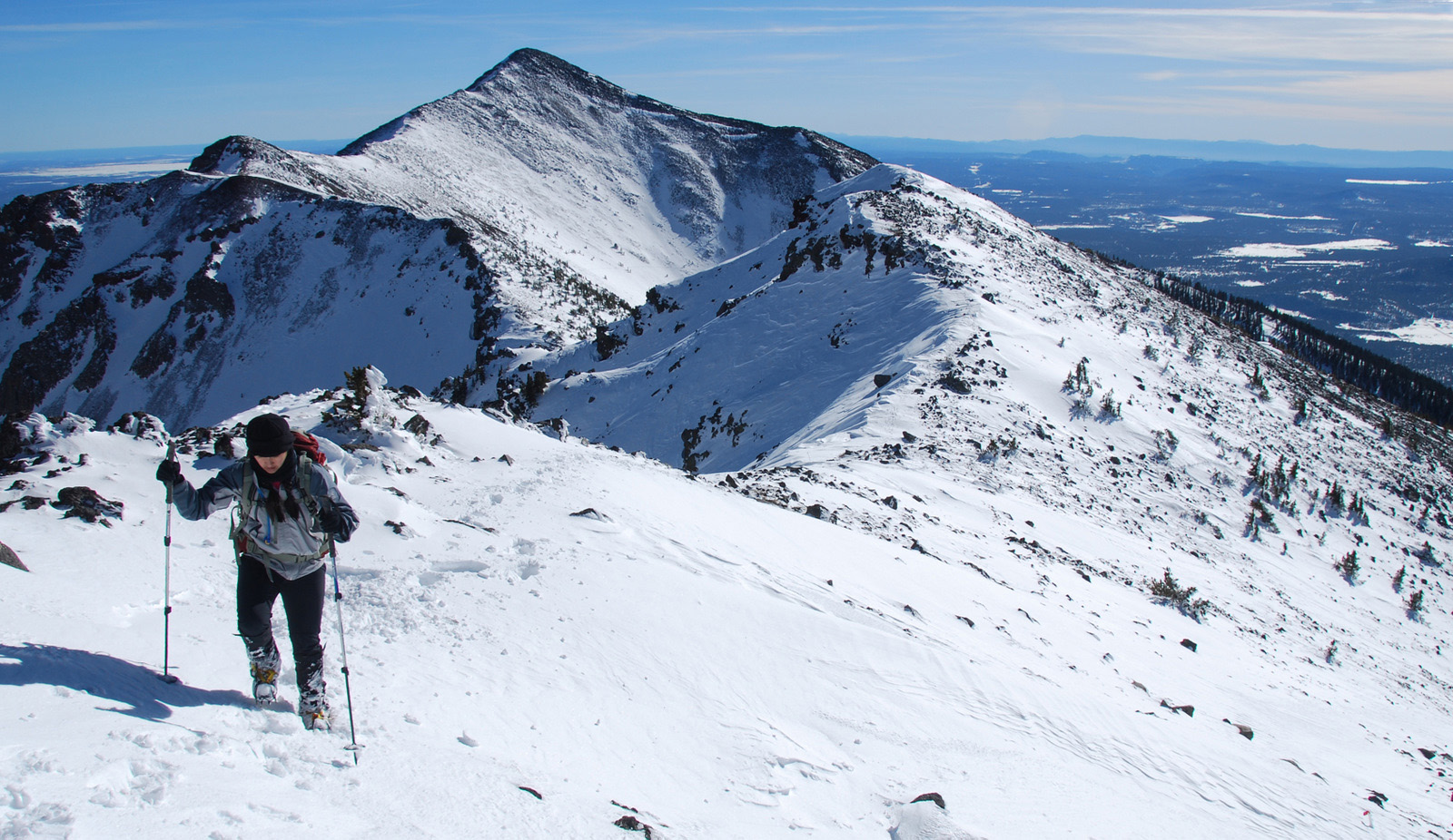 Anna and I had turned back in bad weather on Arizona’s highest point in November of 2009, just two-thirds of a mile and 600 vertical feet from the 12800 foot stratovolcano’s summit. The summit ridge and the overall dominance of the mountain over its surroundings had initially attacted me to this peak, and we made a second attempt on New Year’s Day 2010. We fought through deep snow on steep slopes before we were rewarded with perfect conditions on the summit ridge, calm weather, and a deserted mountain-top.