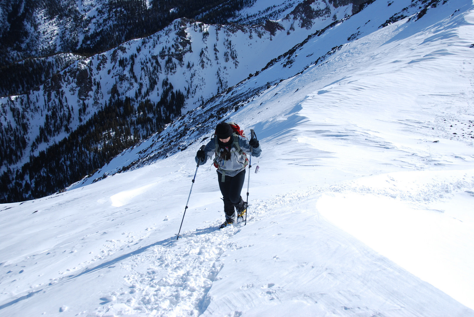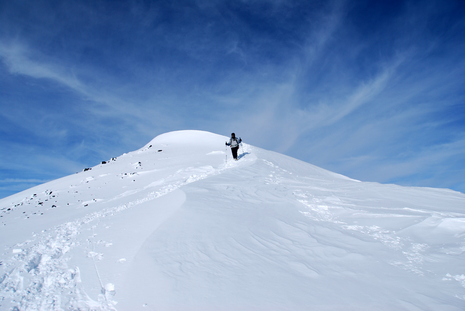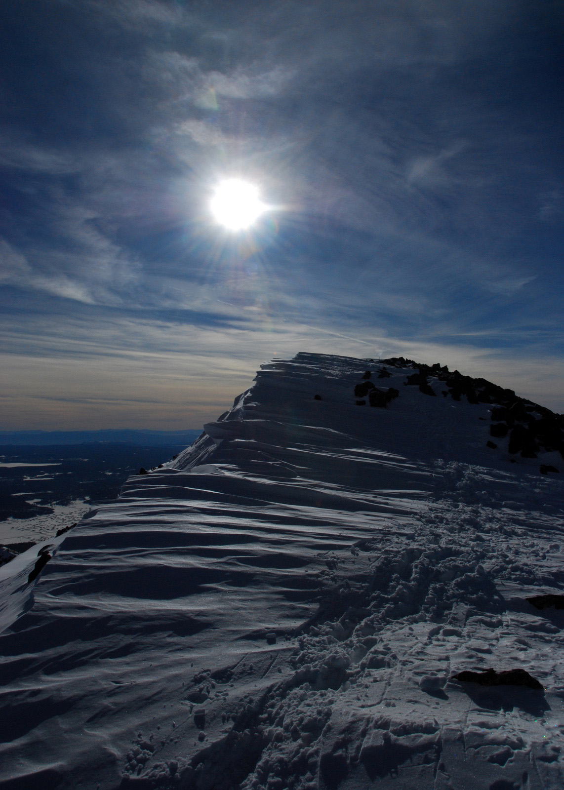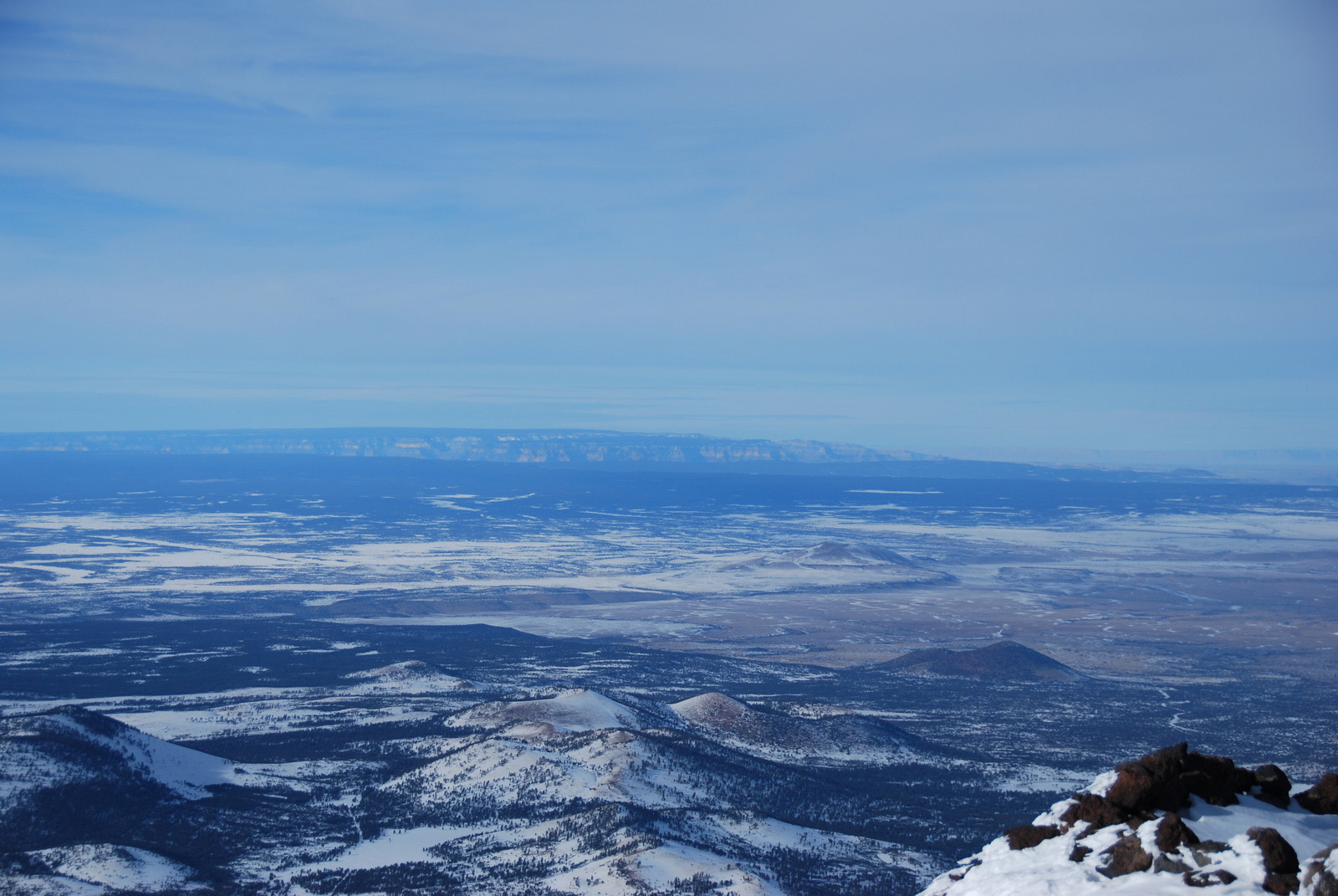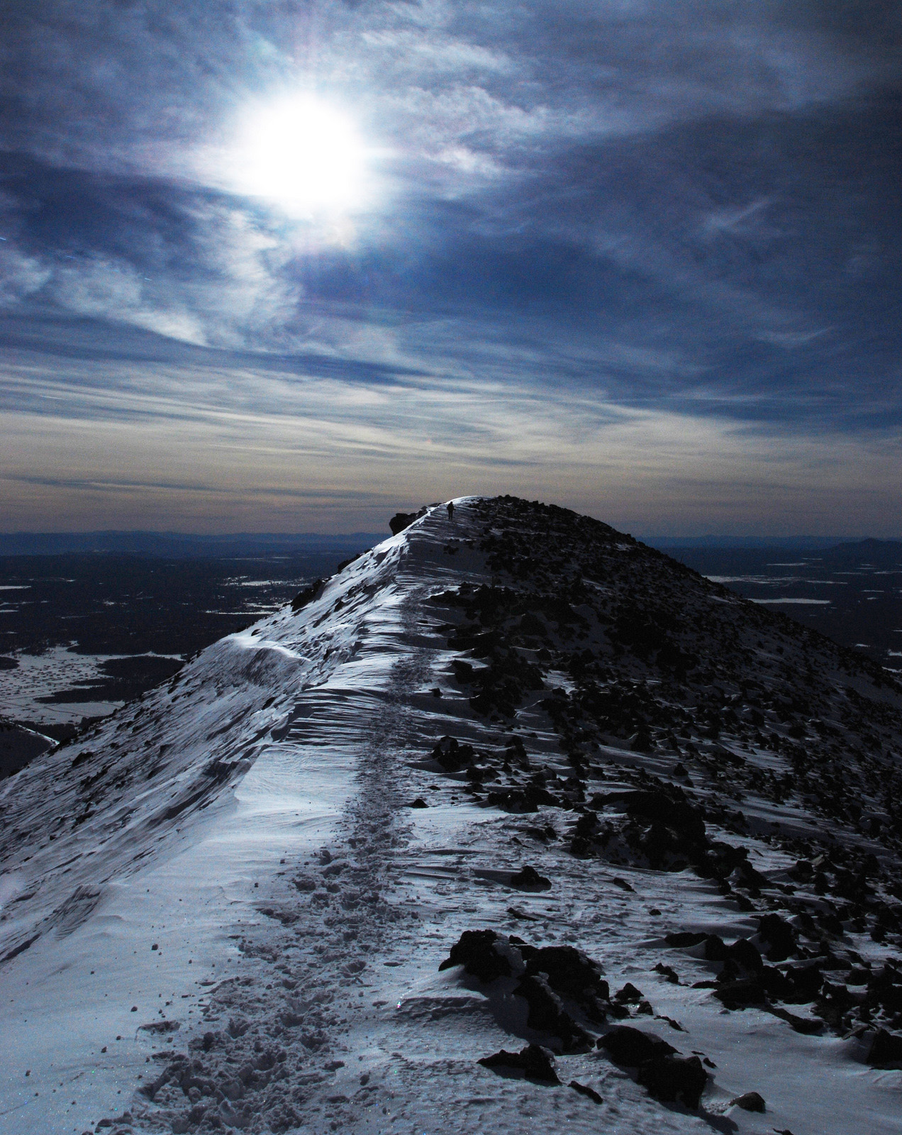 Anna and I had turned back in bad weather on Arizona’s highest point in November of 2009, just two-thirds of a mile and 600 vertical feet from the 12800 foot stratovolcano’s summit. The summit ridge and the overall dominance of the mountain over its surroundings had initially attacted me to this peak, and we made a second attempt on New Year’s Day 2010. We fought through deep snow on steep slopes before we were rewarded with perfect conditions on the summit ridge, calm weather, and a deserted mountain-top.