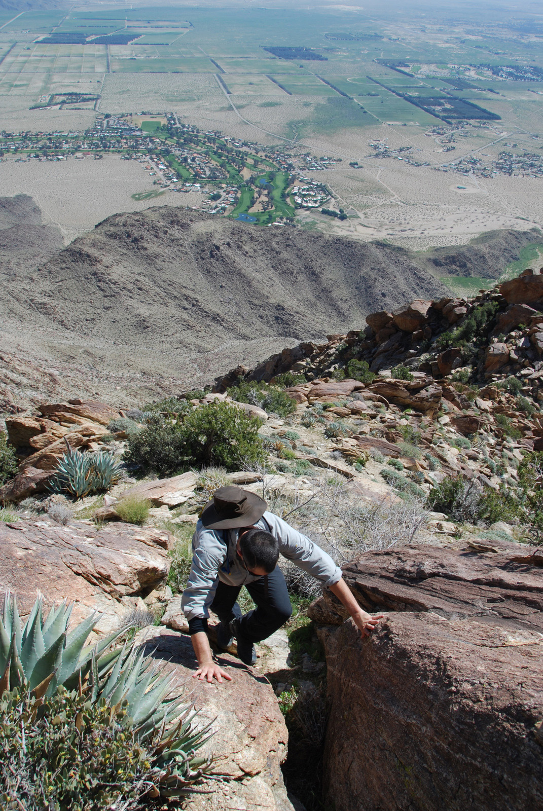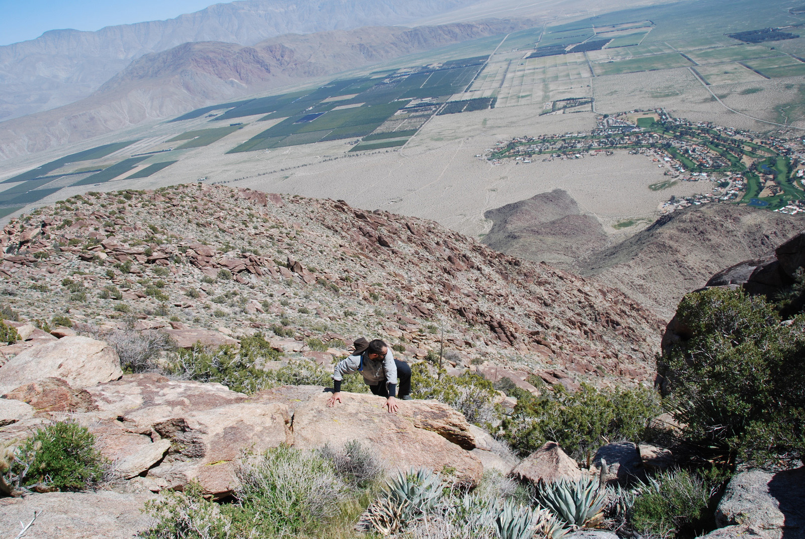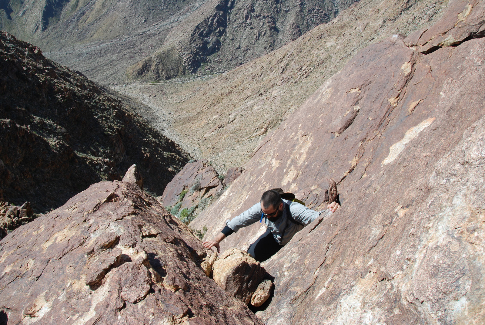 Overlooking Borrego Springs in the Anzo Borrego desert, I was first attracted to Indianhead Peak when I read its description, “there is no easy way to the summit.” The excellent views and high quality scrambling took our minds off the many cactus induced cuts and pricks. We descended the “normal” route, finishing with a mellow and much-deserved stroll through Palm Canyon.