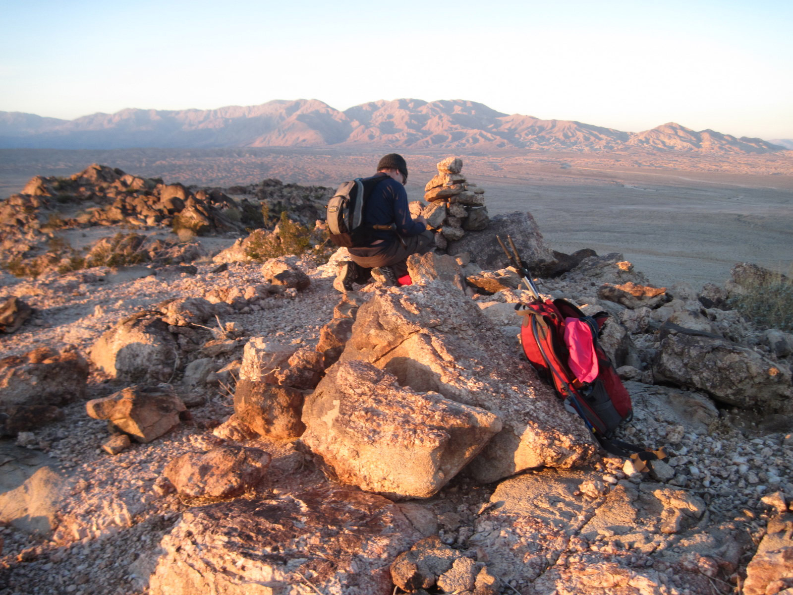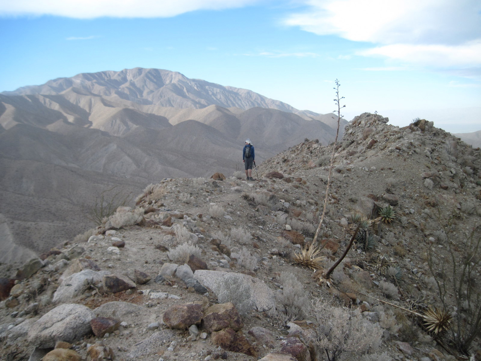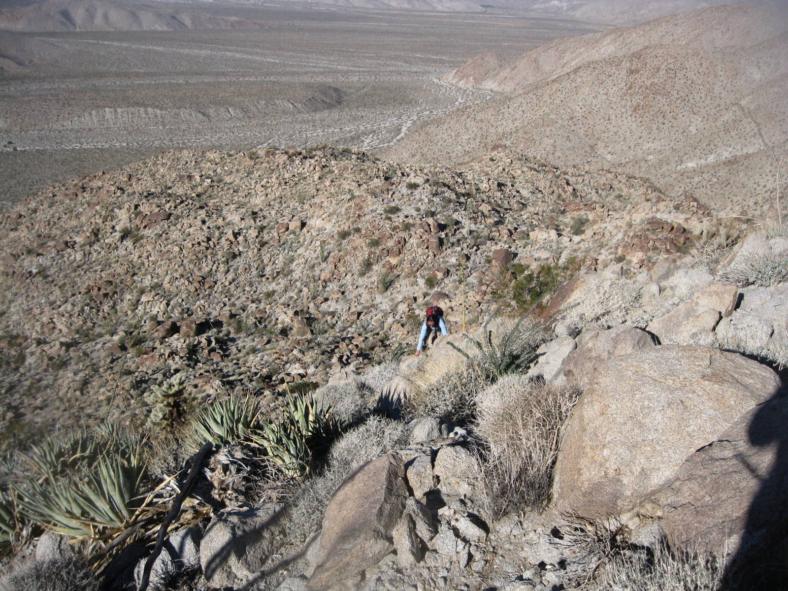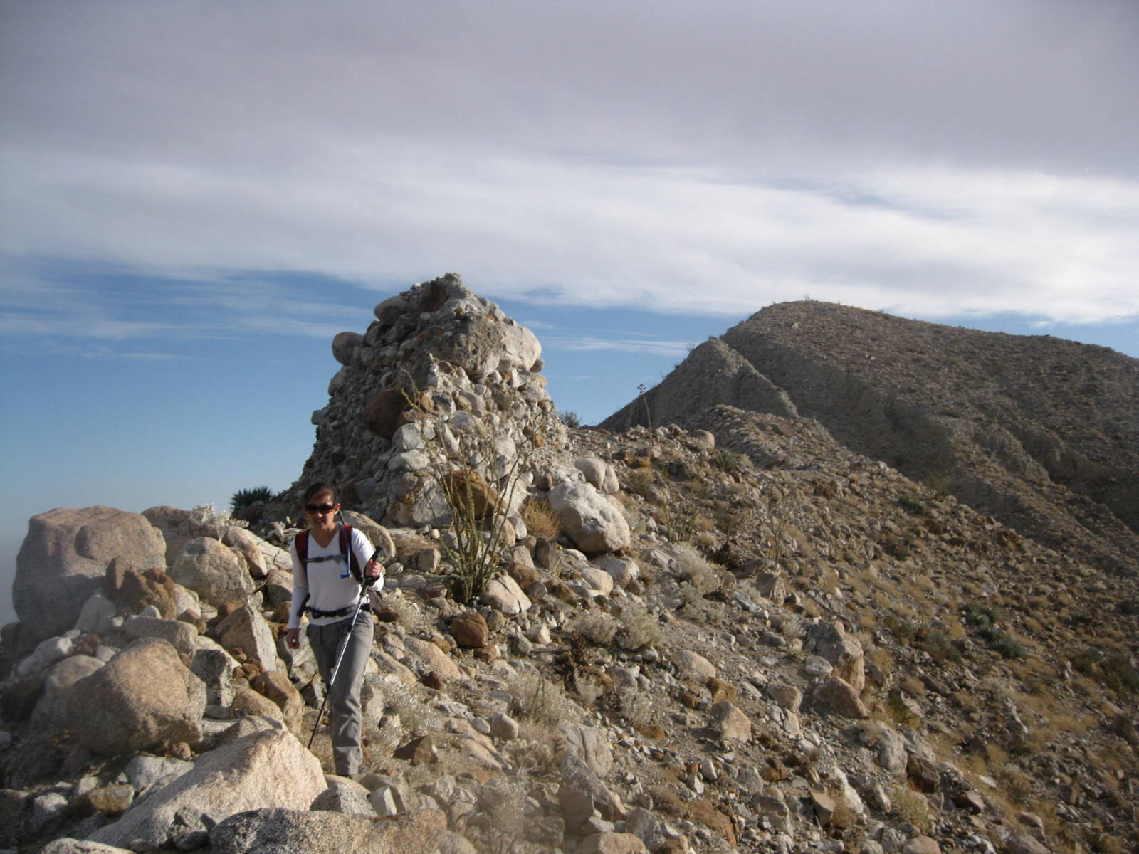 Continuing with the San Diego County peak list, we knocked off 5 more peaks in the Anza Borrego desert: Coyote, Palm BM (Traveler), Sunset, and Borrego Mountain (both east and west buttes). The terrain varied considerably between each peak – from imbedded and polished rock giving good footing on Coyote, to loose gravel and huge boulders on Sunset, to trails and slot canyons in the Borrego Mountains. The short days make it tough to cram the peaks in like we want, ending up at Carlee’s (the local bar’n’grill in Borrego Springs) earlier than we’d like.