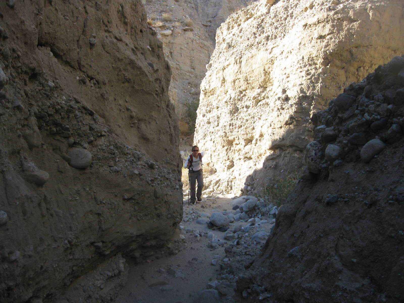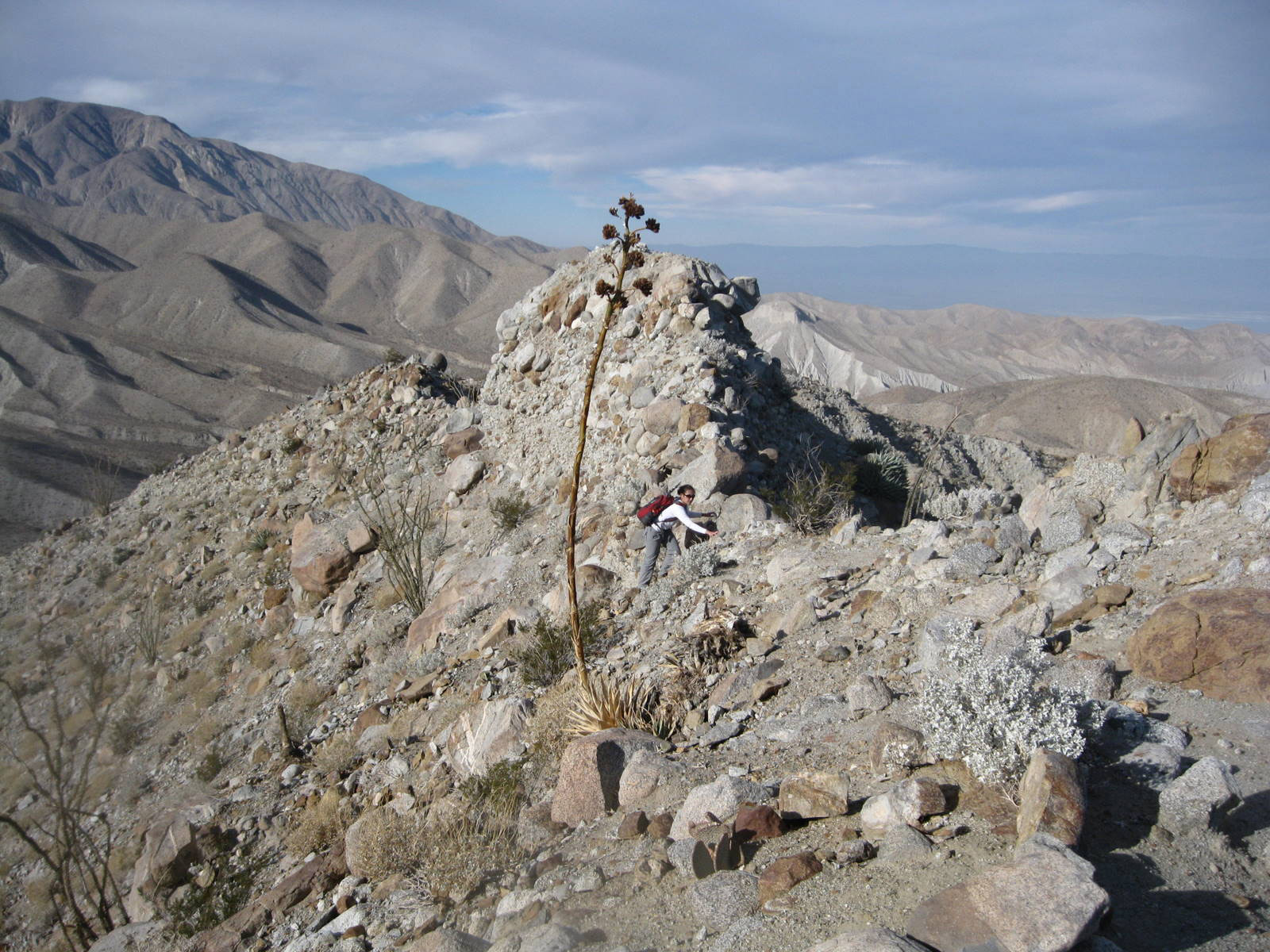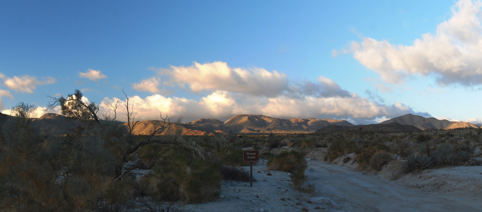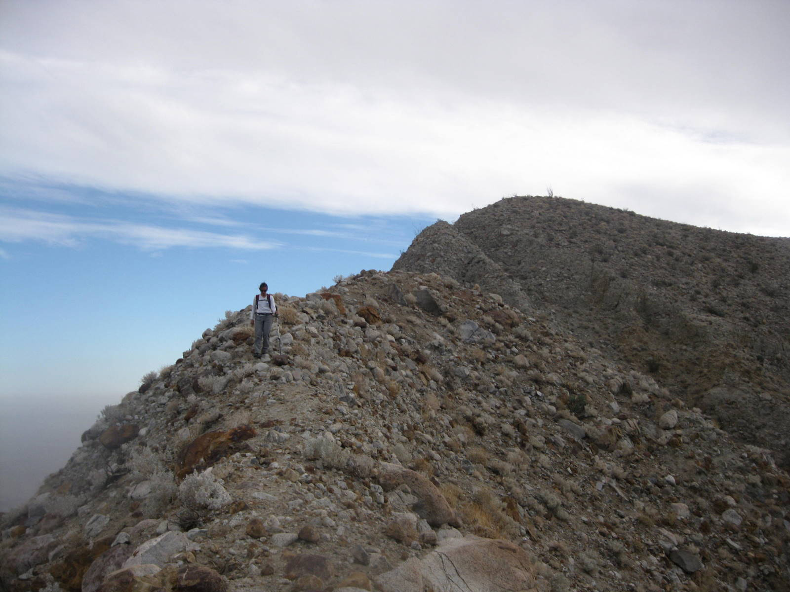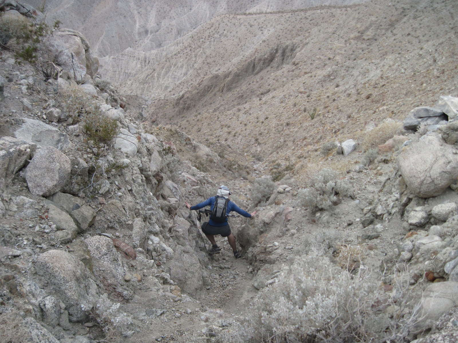 Continuing with the San Diego County peak list, we knocked off 5 more peaks in the Anza Borrego desert: Coyote, Palm BM (Traveler), Sunset, and Borrego Mountain (both east and west buttes). The terrain varied considerably between each peak – from imbedded and polished rock giving good footing on Coyote, to loose gravel and huge boulders on Sunset, to trails and slot canyons in the Borrego Mountains. The short days make it tough to cram the peaks in like we want, ending up at Carlee’s (the local bar’n’grill in Borrego Springs) earlier than we’d like.