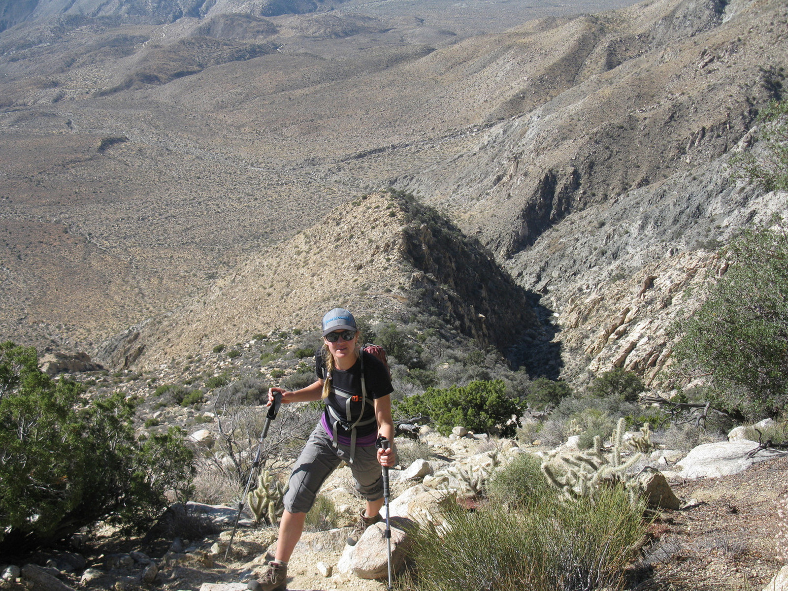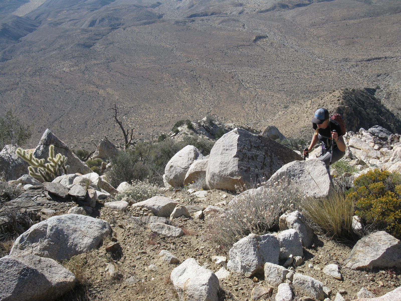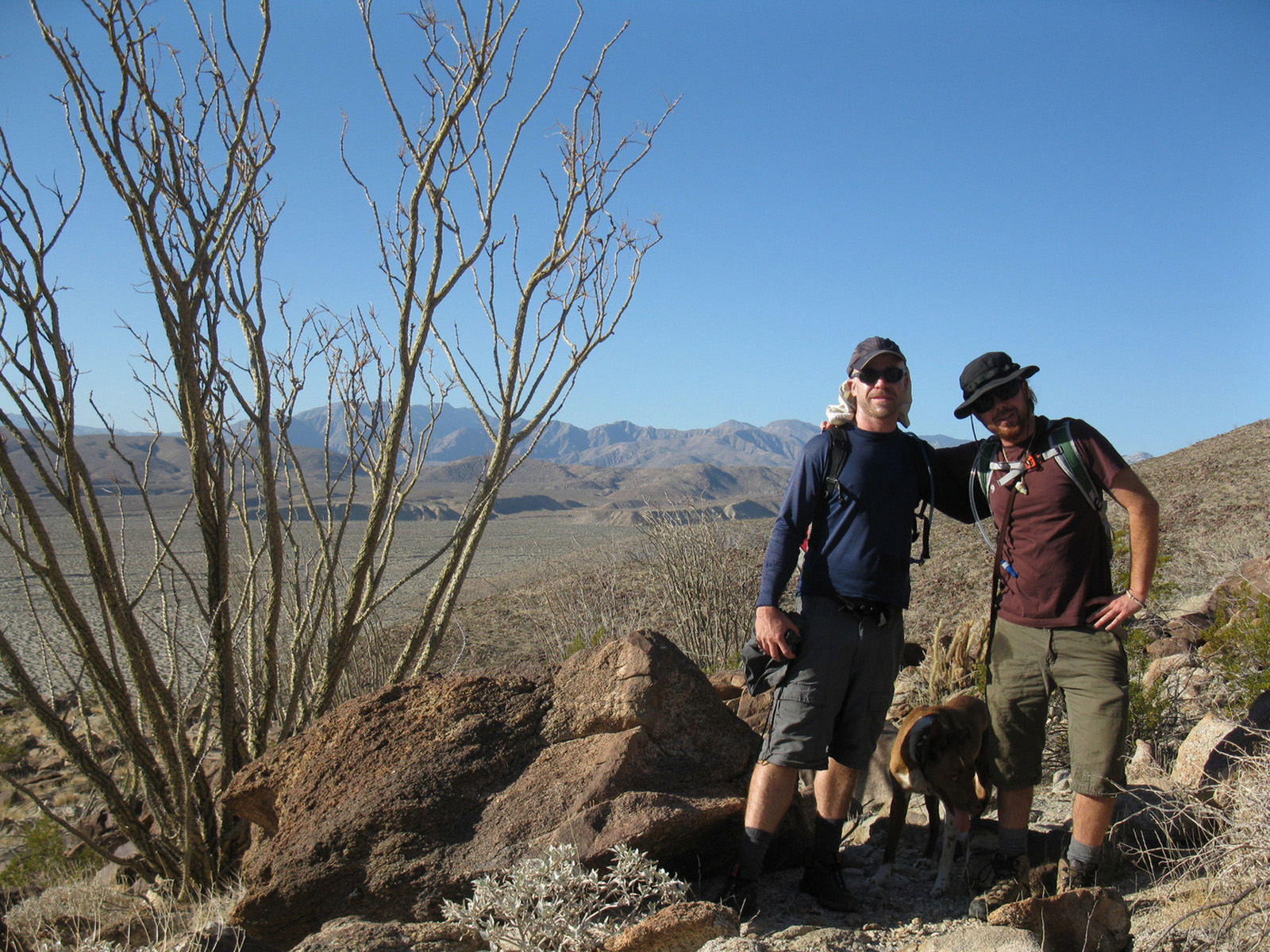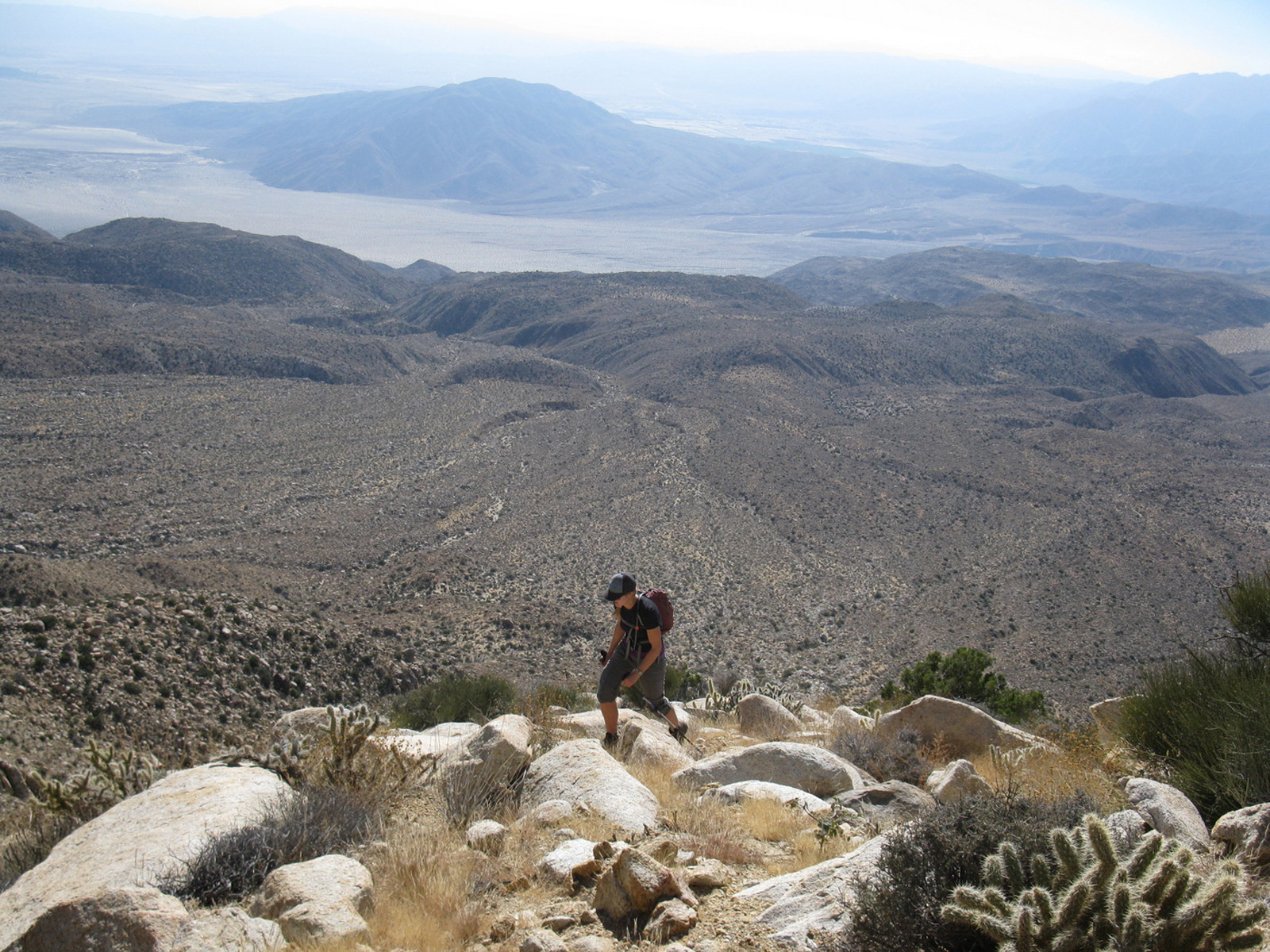 Peak 6582 (aka Lorenzens Peak, aka Dawns Peak) was really the only peak around Anza Borrego that I’d yet to hit. One of the more strenuous peaks in the area, the ascent includes a series of ridges and sandy washes that lead up to a plateau below the peak, followed by a sharp 3000 foot ascent in less than a mile to the summit. I spent the previous evening and night with friends Jeff Manchester (+ dog Gravy) and April Goebl, hiking through a slot canyon, and then enjoying a few beers near Clark Dry Lake Bed. The 4 of us started off for P6582 the next morning, checked out some pictographs en route, and April and I continued on as Jeff and Gravy peeled off to check out some other desert sights as planned. April and I had beautiful weather and views after sweating it out on the final ascent, arrived back at the car just after dark, and enjoyed a nice meal at Carlee’s back in Borrego Springs before the drive home. A very fulfilling short and last-minute weekend J