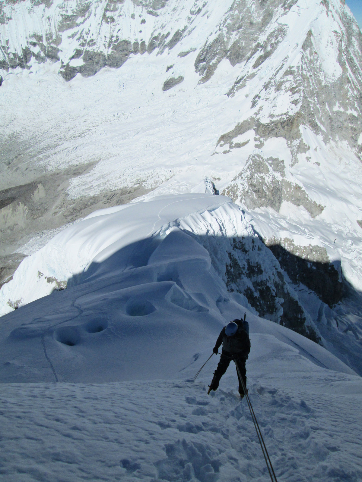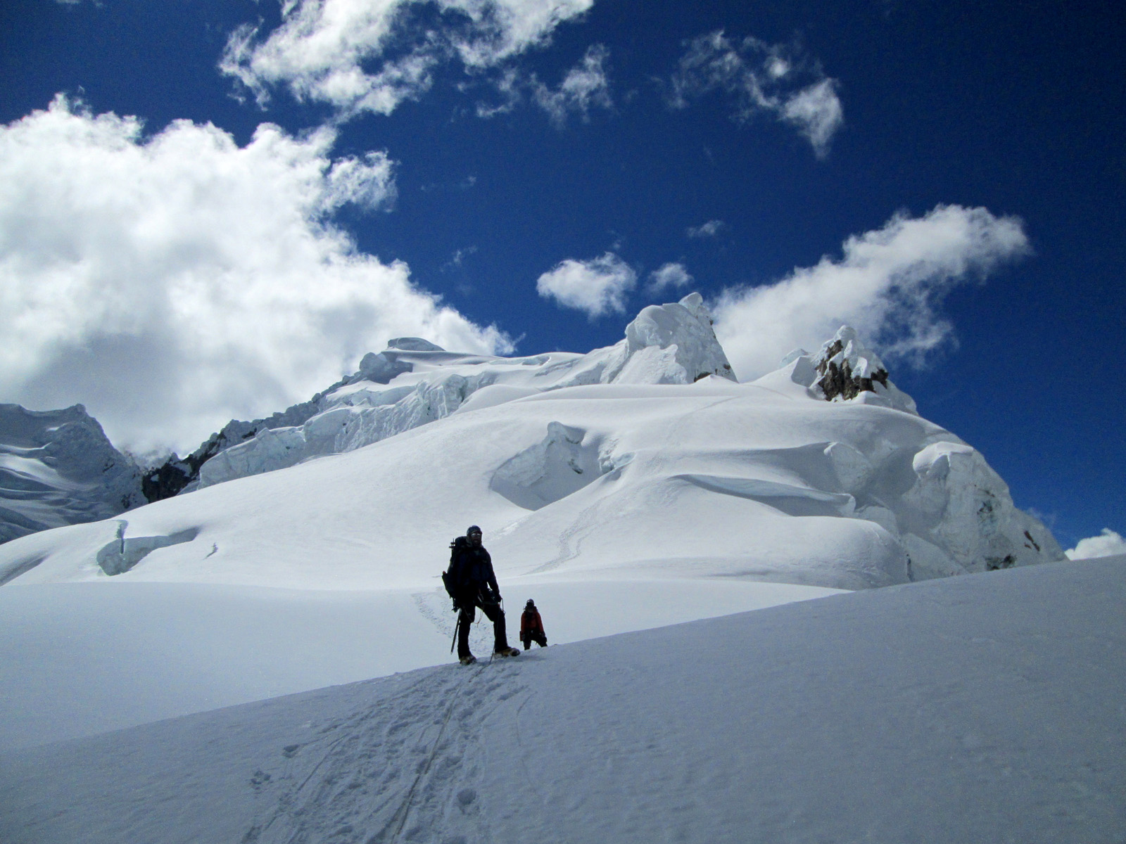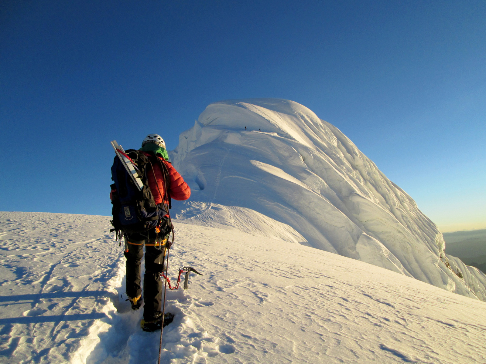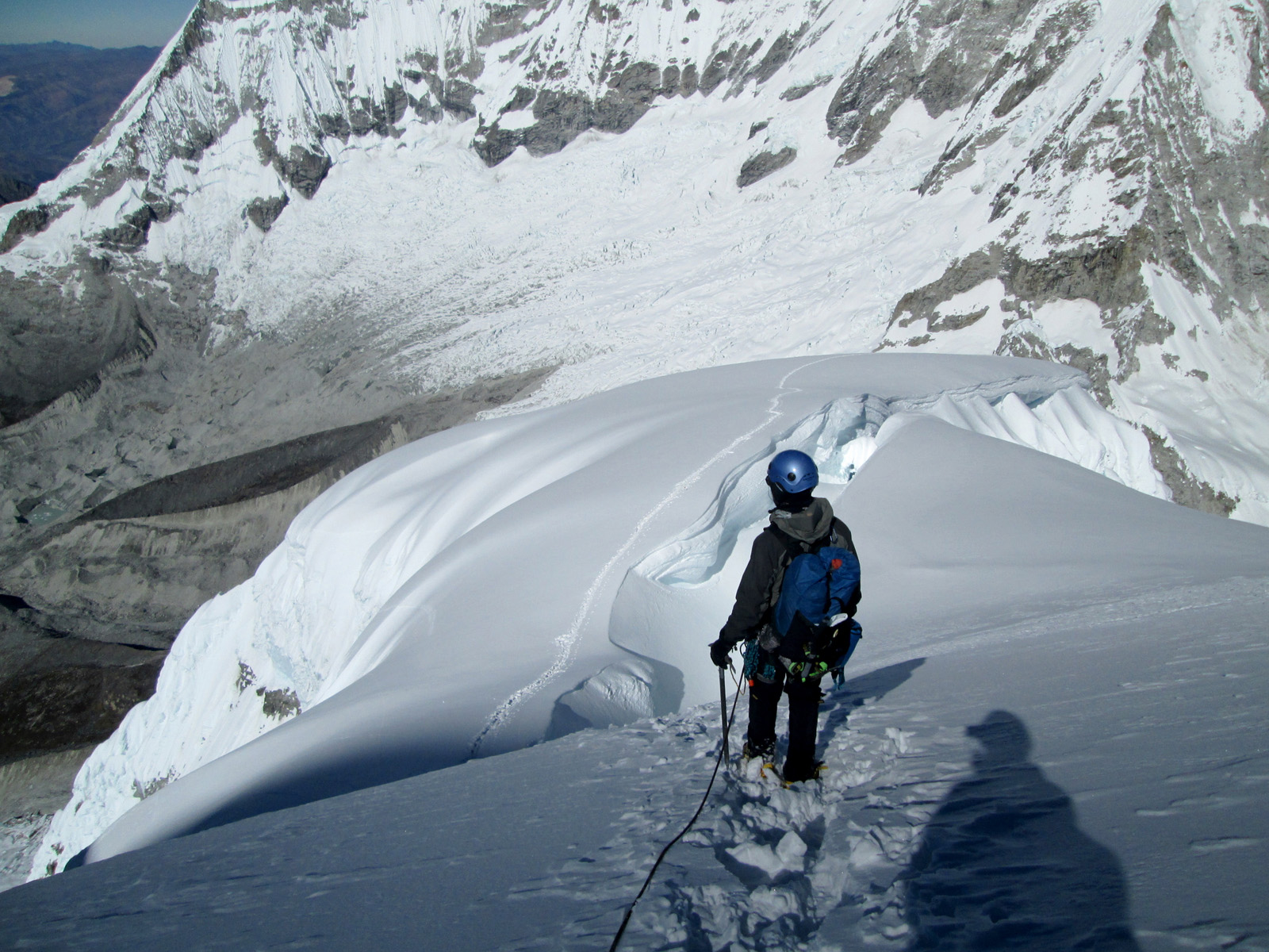 Along with friends Phil Wegge and Phil Stinis, we visited Peru and Bolivia to check some of their high and very accessible mountains. We were 4 for 4 in Peru, climbing Urus Este (17782′), Ishinca (18143′), Pisco (18871′), and Chopicalqui (20817′), the latter being a very exciting climb indeed. We had to abandon our plans of climbing Sajama in Bolivia due to high wind, but climbed Parinacota (20827′) and Acotango (19856′) on the Chilean border, two very scenic mountains in an interesting area. While waiting for weather in Bolivia, we ended up with extra time to check out some of the salt flats, and then finished off our trip with a huge 11000′ descent down the Bolivian “death road” on mountain bikes. We also ran into Bogotá, Colombia, on our layover on the way home…ahhhhh….