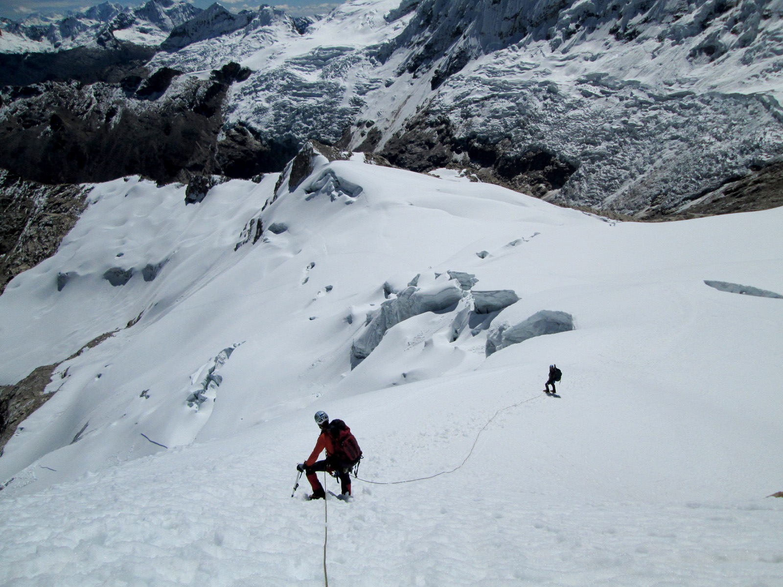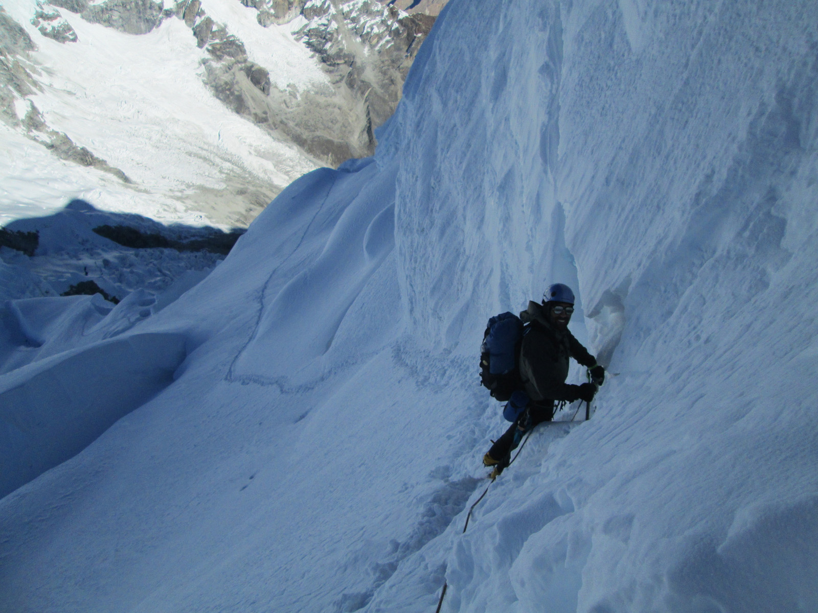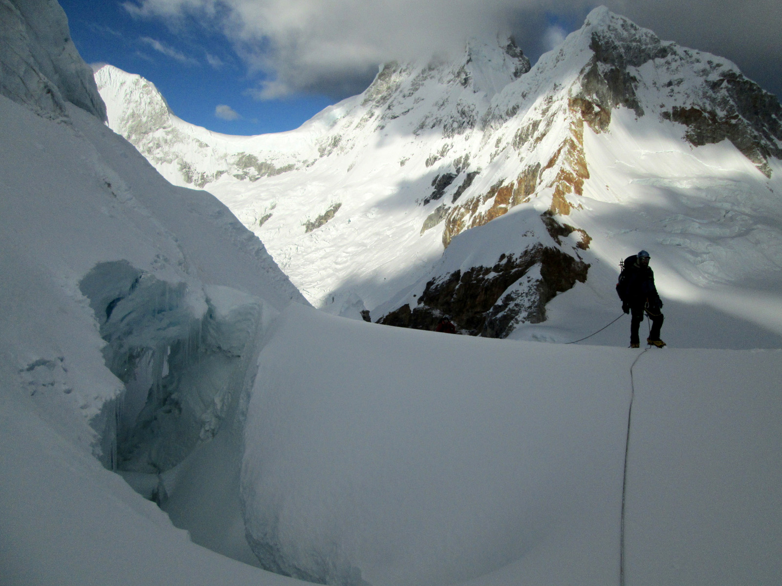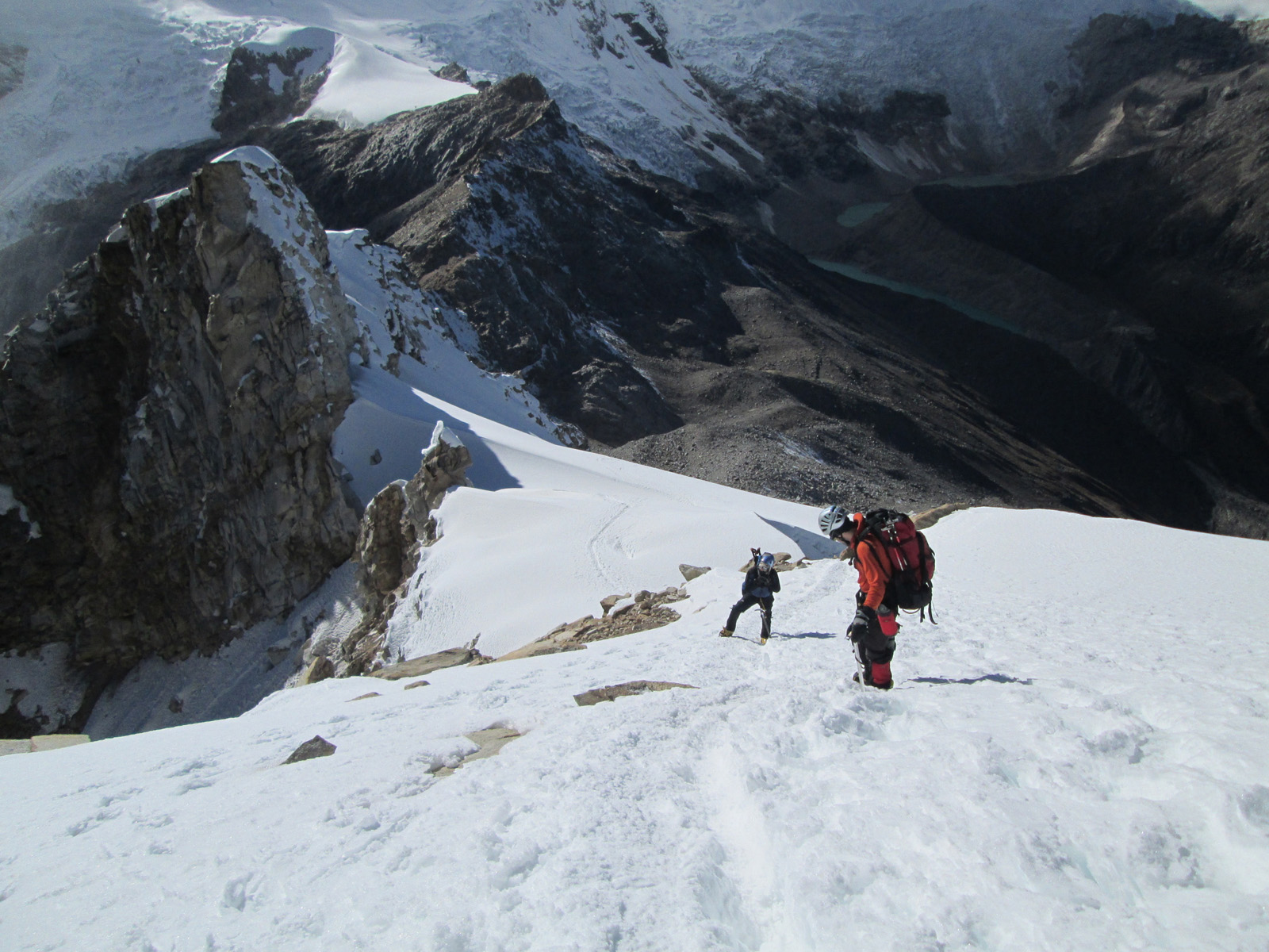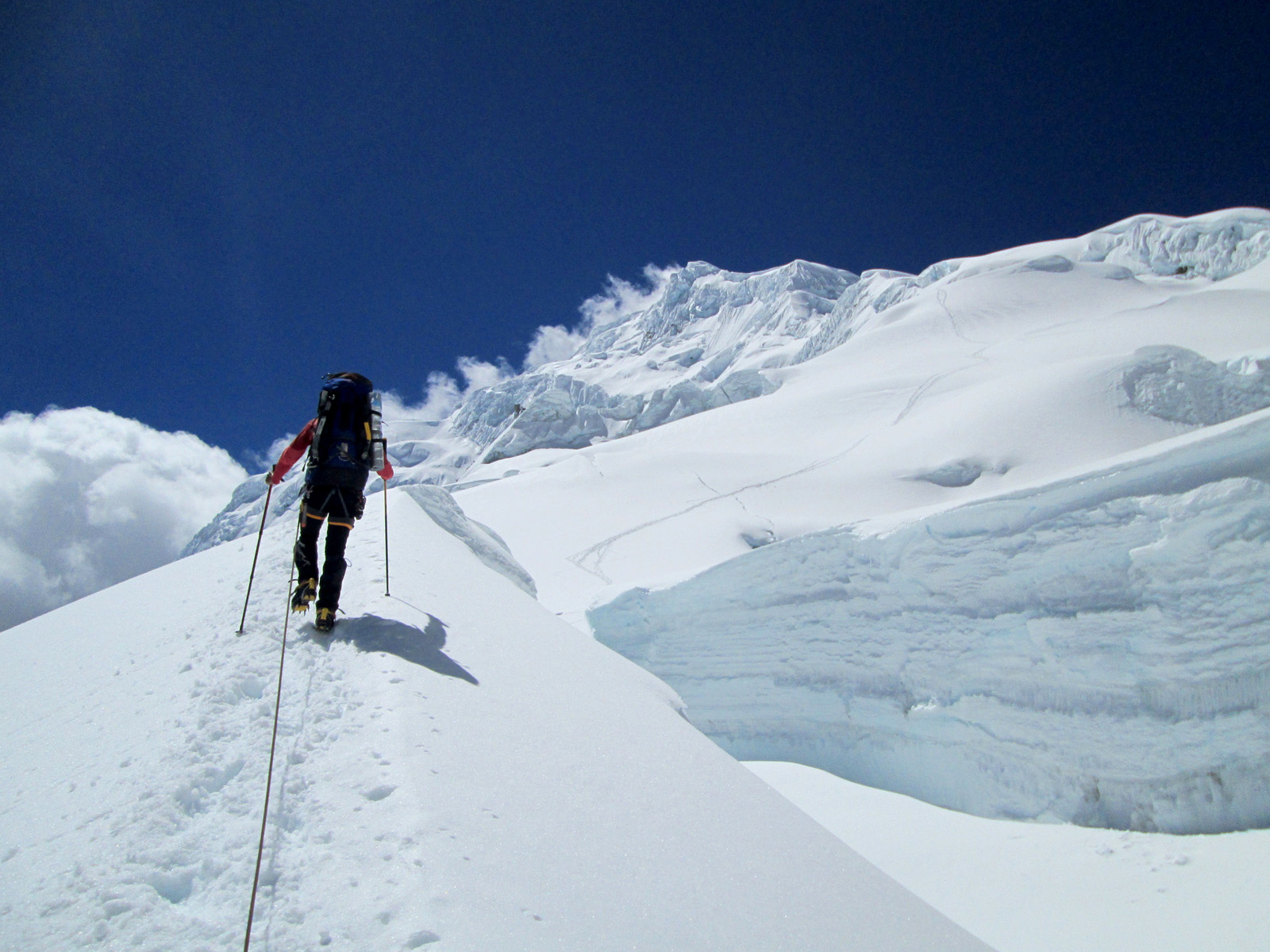Along with friends Phil Wegge and Phil Stinis, we visited Peru and Bolivia to check some of their high and very accessible mountains. We were 4 for 4 in Peru, climbing Urus Este (17782′), Ishinca (18143′), Pisco (18871′), and Chopicalqui (20817′), the latter being a very exciting climb indeed. We had to abandon our plans of climbing Sajama in Bolivia due to high wind, but climbed Parinacota (20827′) and Acotango (19856′) on the Chilean border, two very scenic mountains in an interesting area. While waiting for weather in Bolivia, we ended up with extra time to check out some of the salt flats, and then finished off our trip with a huge 11000′ descent down the Bolivian “death road” on mountain bikes. We also ran into Bogotá, Colombia, on our layover on the way home…ahhhhh….