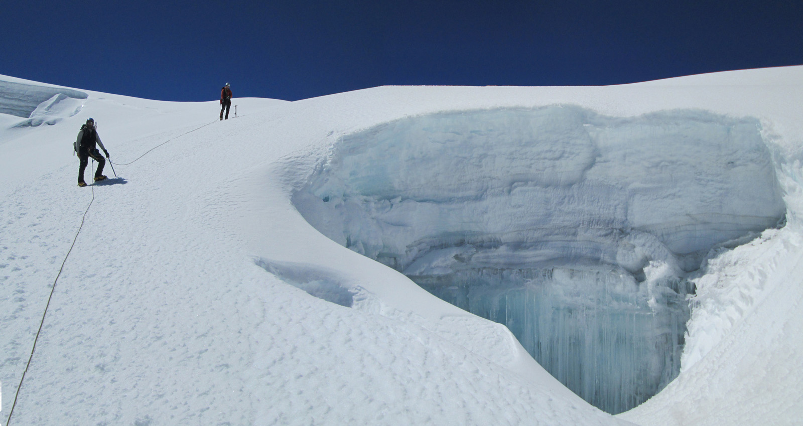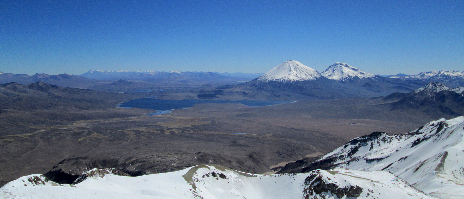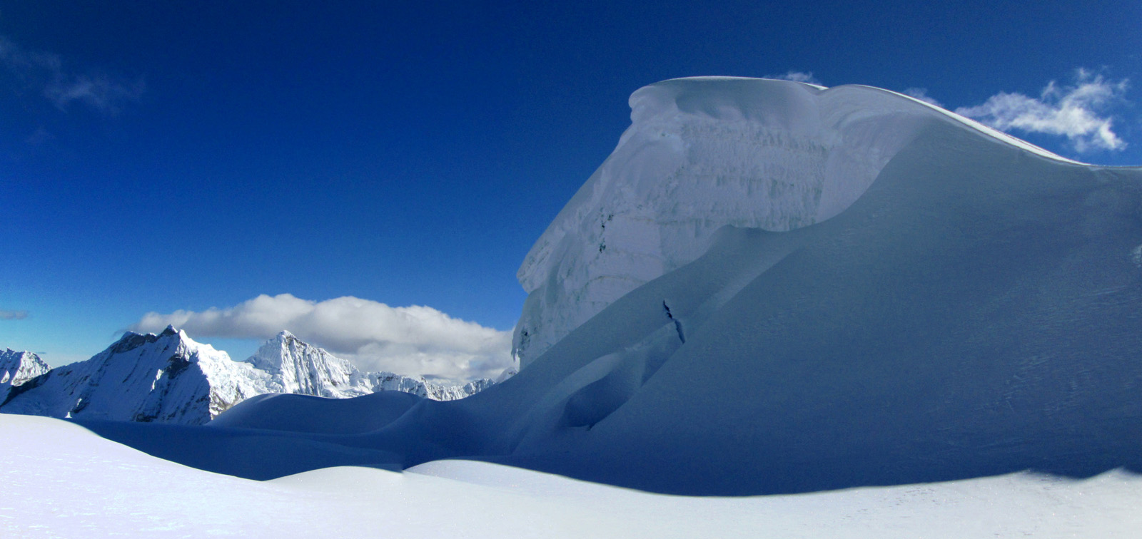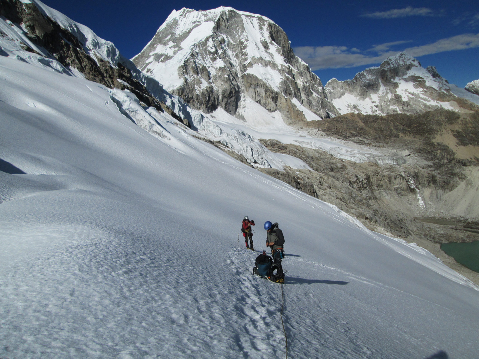 Along with friends Phil Wegge and Phil Stinis, we visited Peru and Bolivia to check some of their high and very accessible mountains. We were 4 for 4 in Peru, climbing Urus Este (17782′), Ishinca (18143′), Pisco (18871′), and Chopicalqui (20817′), the latter being a very exciting climb indeed. We had to abandon our plans of climbing Sajama in Bolivia due to high wind, but climbed Parinacota (20827′) and Acotango (19856′) on the Chilean border, two very scenic mountains in an interesting area. While waiting for weather in Bolivia, we ended up with extra time to check out some of the salt flats, and then finished off our trip with a huge 11000′ descent down the Bolivian “death road” on mountain bikes. We also ran into Bogotá, Colombia, on our layover on the way home…ahhhhh….