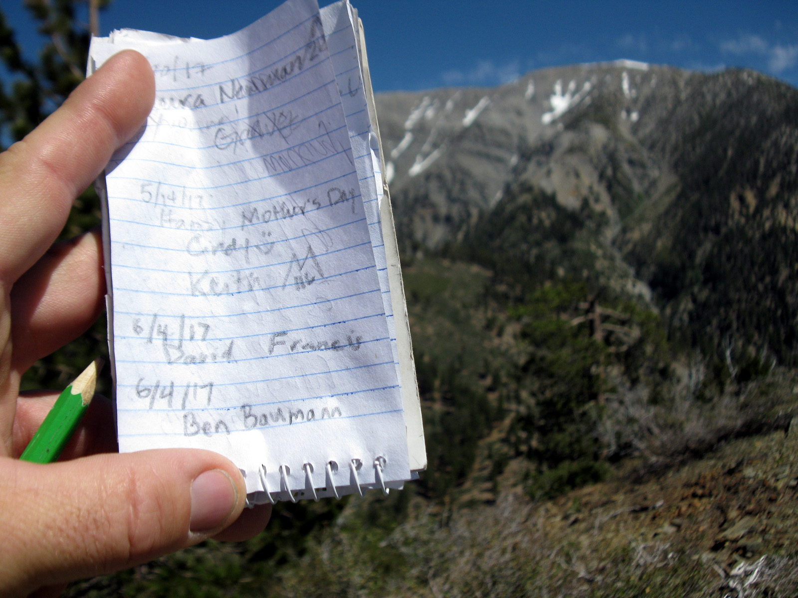 One very memorable thing that happened on this trip is that I ran into David Francis near the summit of Pine Mountain Ridge. David was just leaving the summit as I was arriving and we spoke briefly, but I didn’t realize who he was until I checked the summit register, after which I sped up to catch up to him. We had first met briefly on Squaretop’s summit, a super obscure peak in San Diego in 2012. Since then, we’ve missed each other on another peak by a few hours near Idyllwild a few years back and have been friends on Facebook. David and I caught up on each other’s peakbagging adventures and probably could have talked all afternoon had we each not had plans for more peaks that day 😉 Very cool…