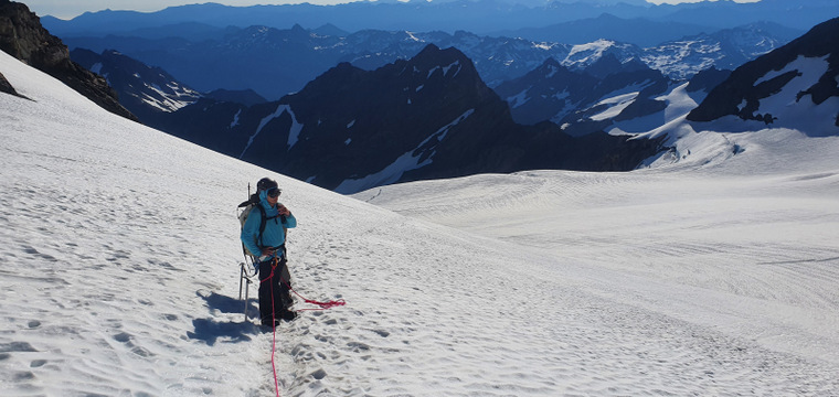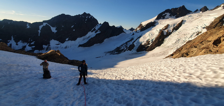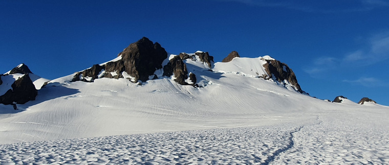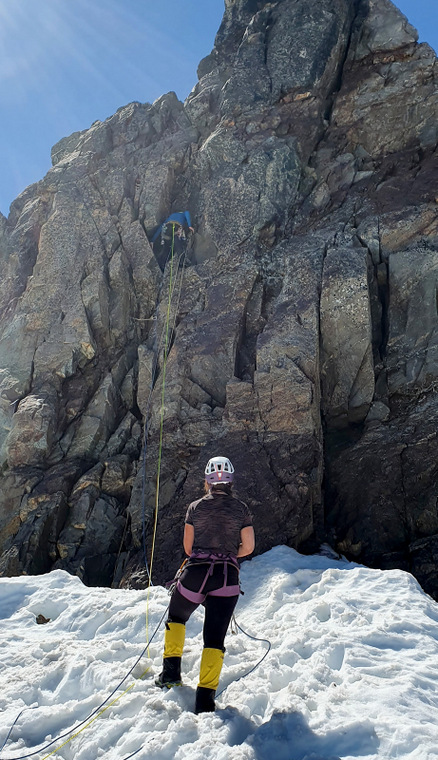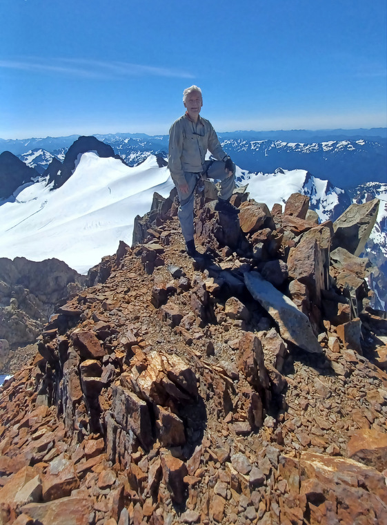 Summit day. We get moving at 3am, first with a steep hike up the moraine, then a drop onto the glacier where we rope up and put on crampons, then a lot of moderate snow up to the summit block. Mike is a little slower and needs extra breaks but is moving pretty well. It takes us a little over 5 hours to get to the summit block and Mike is admittedly very tired but in good spirits. We wait for another party to rappel off, I climb up and give Tony and Mike a belay. The rock climb isn’t very difficult, maybe a little awkward wearing mountaineering boots. Tony is a new climber on technical rock and struggles a little, Mike absolutely crushes it with laser focus. A lifetime of experience. We celebrate and rappel off the top, Mike much more elegantly than us. We put Mike on the downhill side of the rope for the descent (stronger climbers stay uphill) and he’s moving ok but needs a little direction to avoid open crevasses. A long hike back down the glacier and on to the moraine gets us back on the trail where Mike slows down a lot and starts to zone out. He stumbles here and there and takes a few spills. Where he’d been focused on the climb, he just checked out on the trail. After twelve hours on our feet we lay around camp like lazy felines, have some laughs and crash out early.