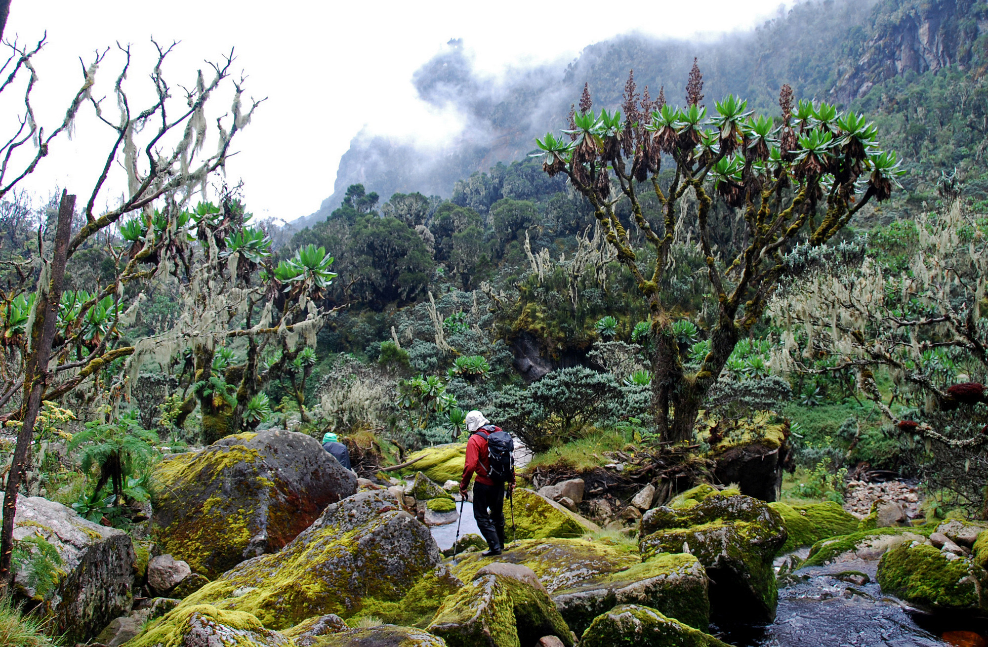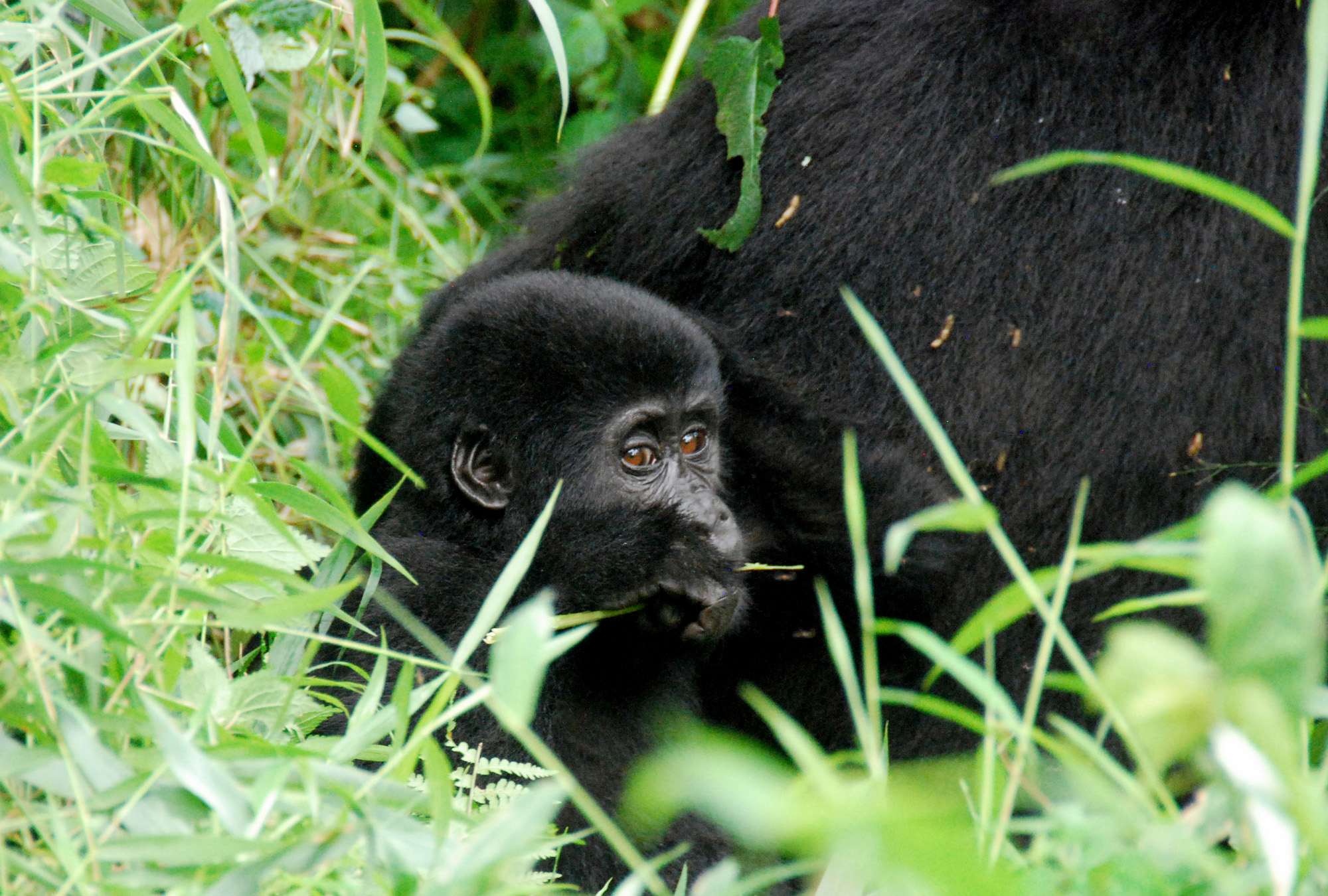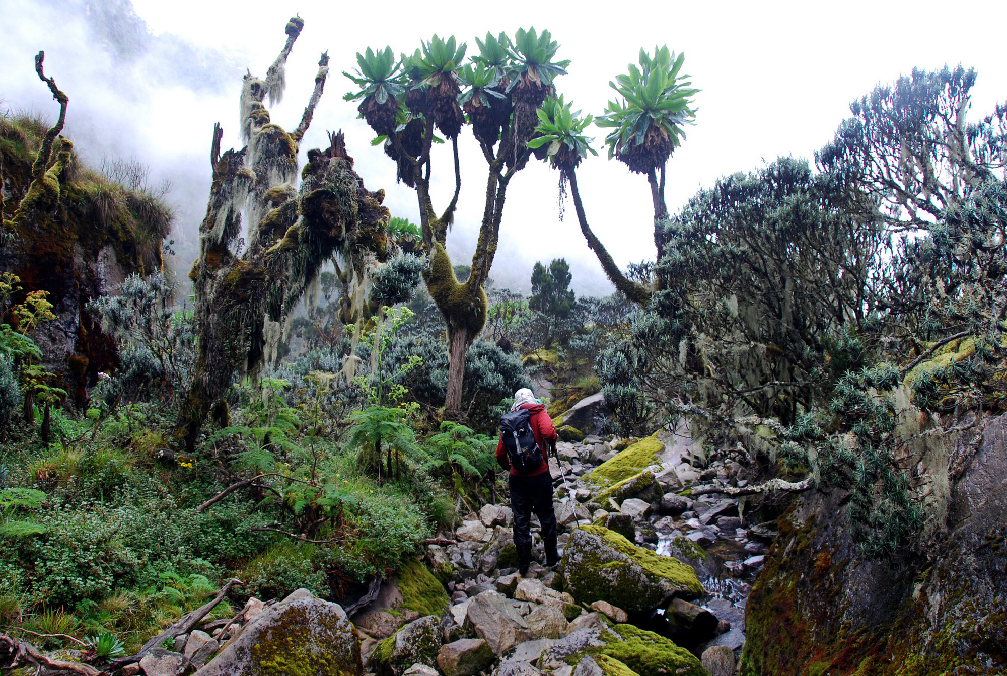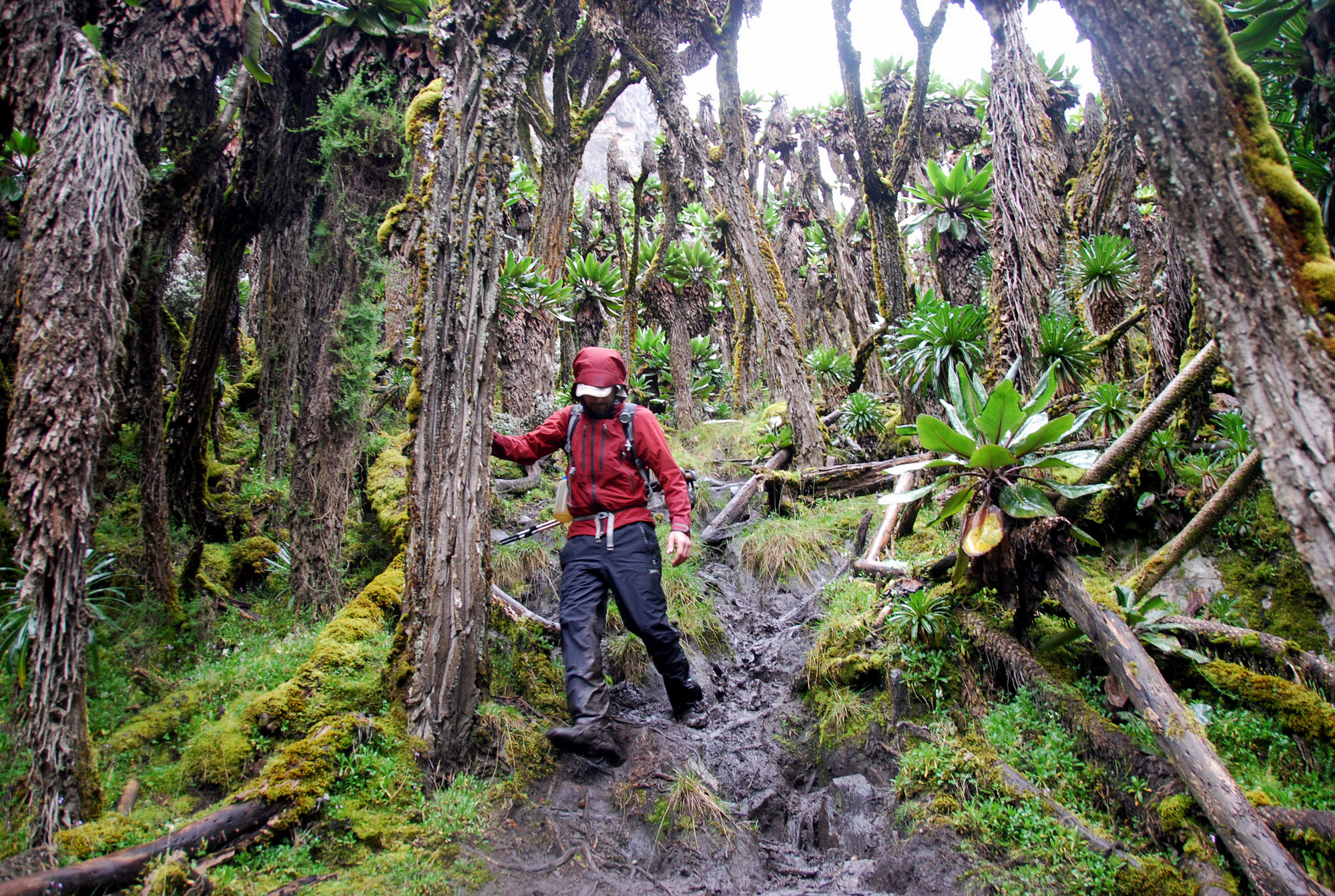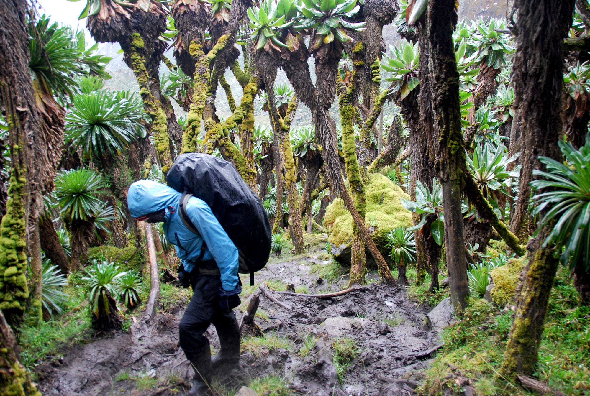 My main reason for visiting Uganda was to climb Mt. Stanley (16762′), Africa’s 3rd highest mountain (and much tougher than the higher two). Located in the Rwenzori Mountains on the border of the Democratic Republic of the Congo (formerly Zaire), the range is notoriously wet and muddy. Friend Philip Wegge and I wore rubber boots for 6 of our 8 days, luckily the unique vegetation kept our minds busy. We had a challenging summit day due to continuous snow fall but overall had a great trip. We visited the Mountain Gorillas in Bwindi Impenetrable Park before crossing into Rwanda…